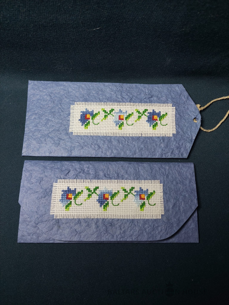 Dāvinājumā komplekts : naudas maks un aploksne apsveikuma kartiņai. Autor darbs., Papīrs, izšuvums roku darbs. Izm. Naudas maks-18,5x8,5cm, aploksne- 19,5x9cm.