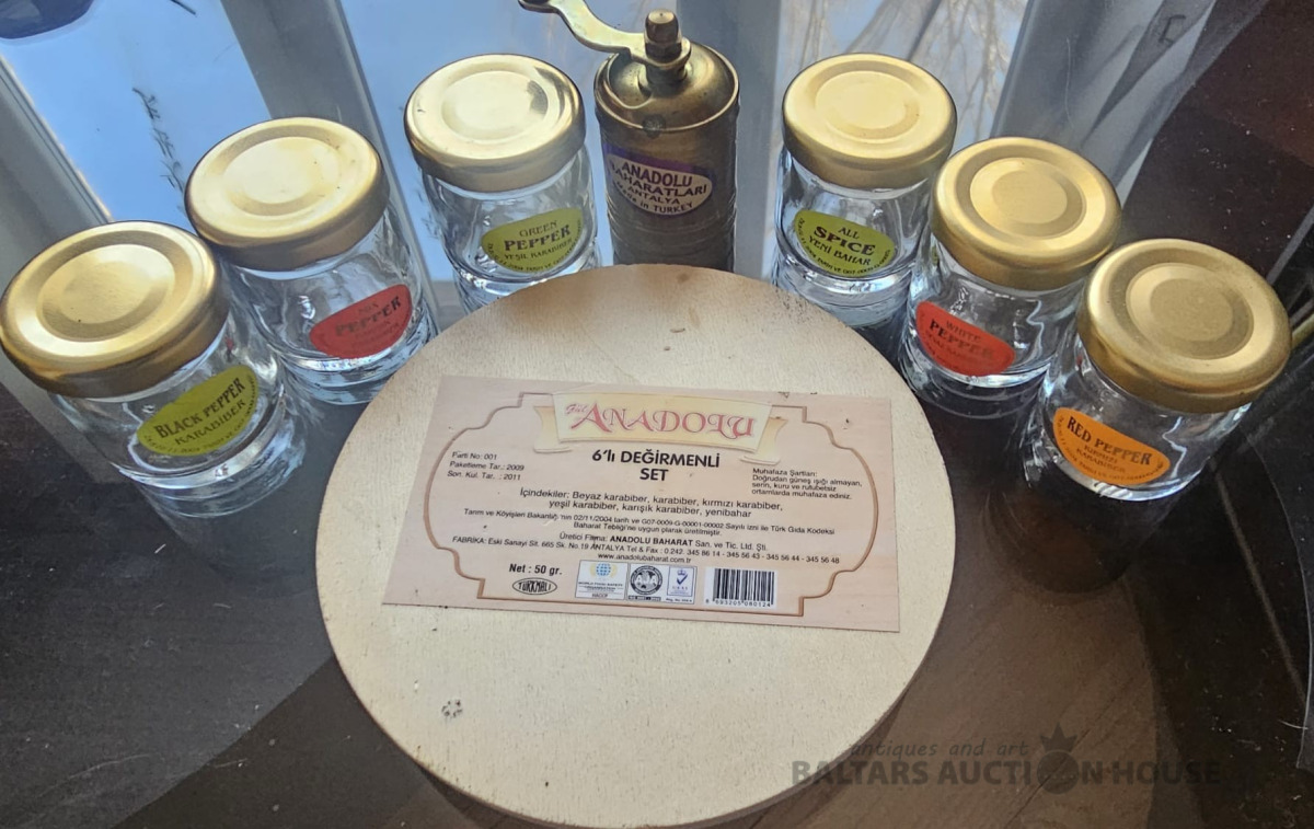Metālā dzirnaviņas un burciņu komplekts 6 veidu pipariem (garšvielām), nelietota!