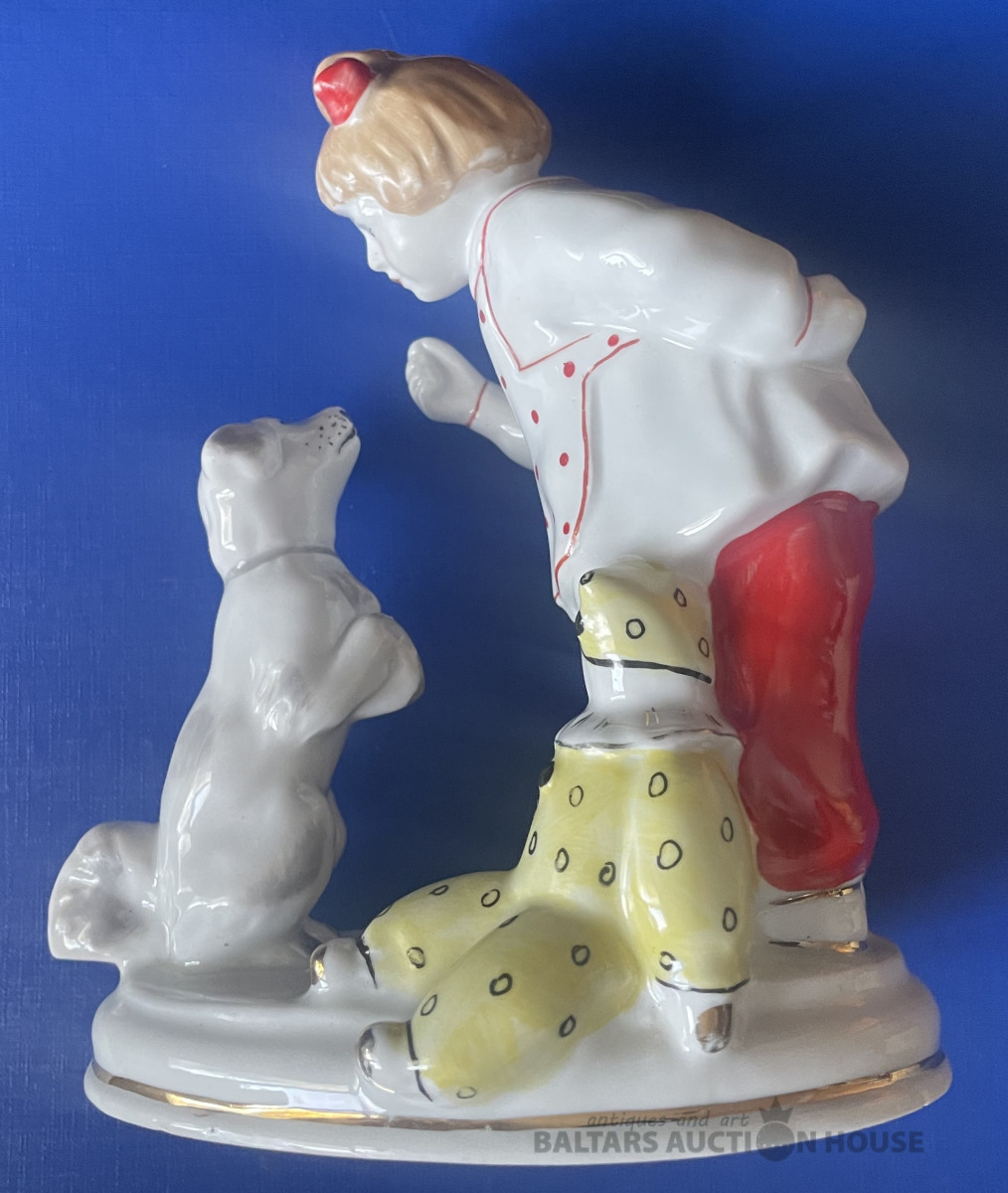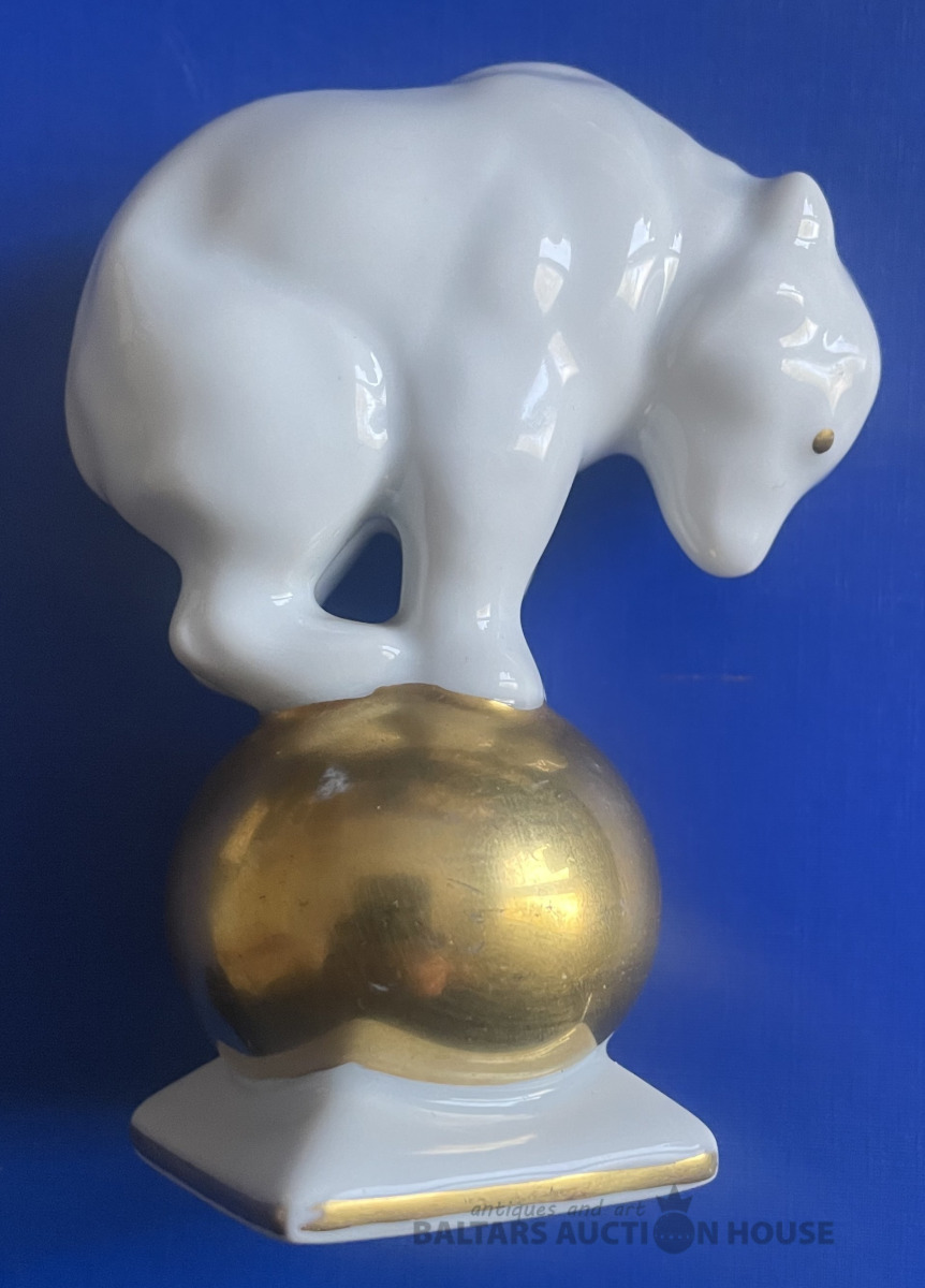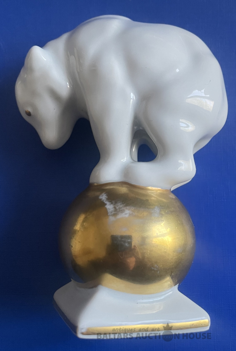 Figūriņa "Lācītis uz zelta bumbas" porcelāns, zeltījums samērā labi saglabāts, h=10,5 cm, Kuzņecova f-ka, Rīga