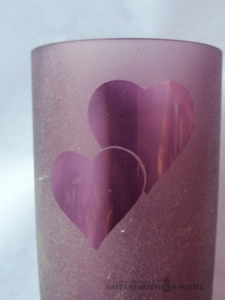 Vāze ar divu siržu attēlu, krāsains stikls, augstums 16,5 cm, diametrs augšā 6,5 cm. Nelietota.
