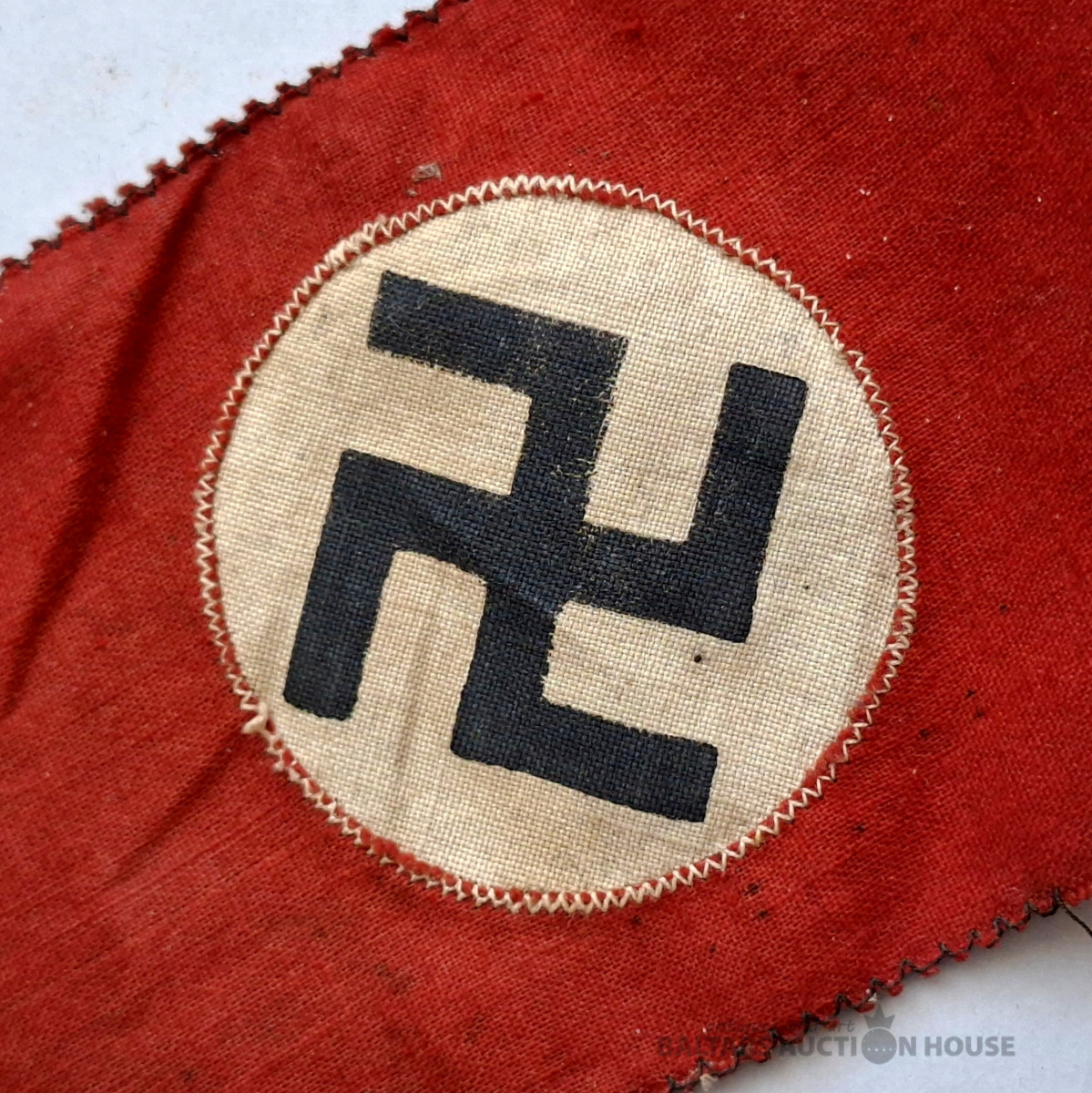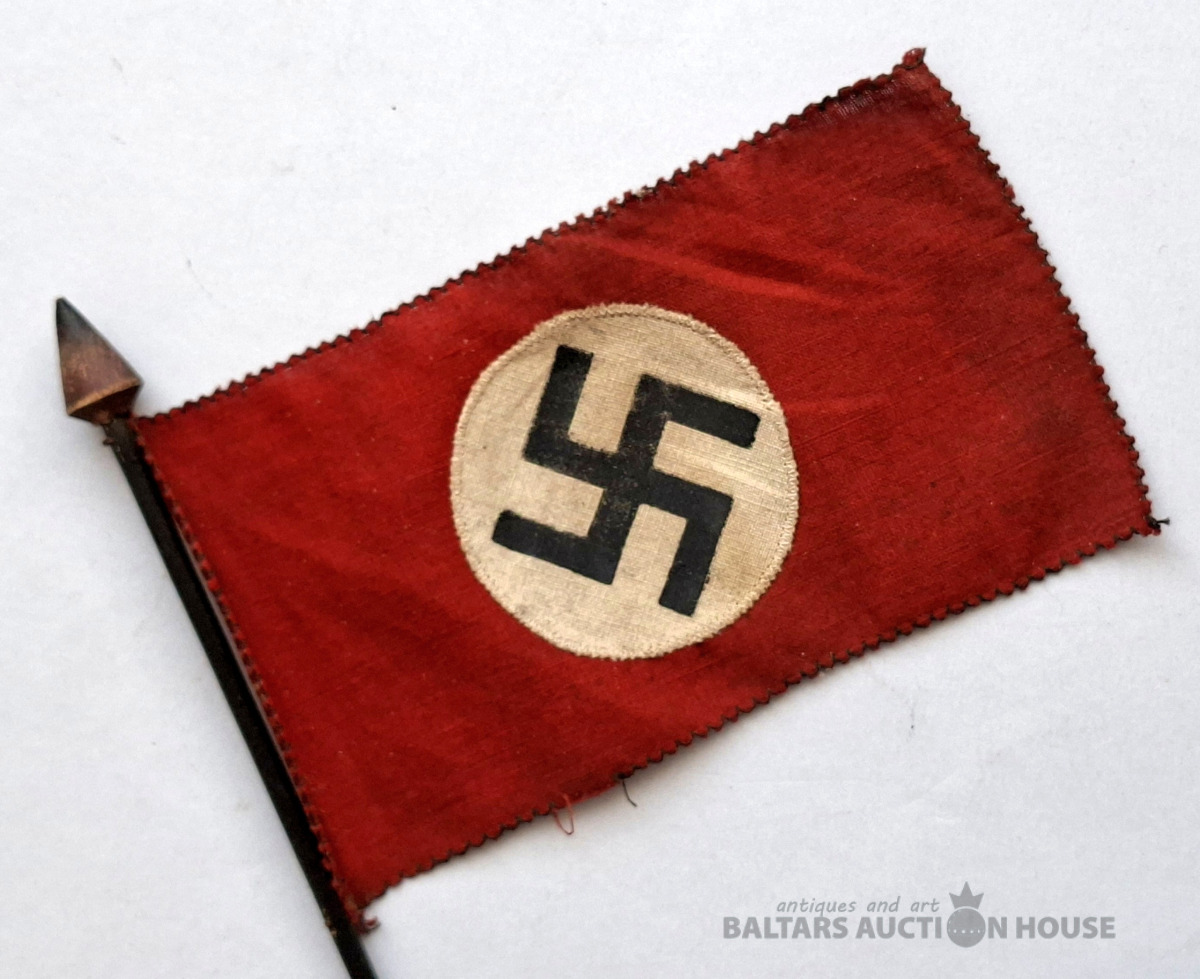 Trešā reiha patriotiskais karogs. Vācijas divpusējs valsts karogs Trešā reiha laikā, 1933.–1945. gads. Karogs karājas uz koka stieņa, kura izmēri ir 13,5 x 8 cm. Stieņa garums ir 31 cm.