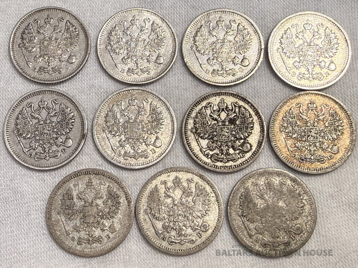 Cara Krievija - 10 Kapeikas - 11 monētas - 1902-1915 gadi, Nikolajs II - komplekts - sudrabs - visi gadi dažādi! 1902, 05, 07, 08, 09, 10, 11, 12, 13, 14, 15