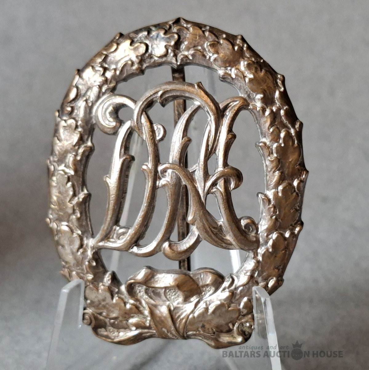 DRA sporta kvalifikācijas nozīmīte "sudrabā", 2. šķira. Vācija, Veimāras Republika. Izgatavota ap 1920. gadu Berlīnes juvelierizstrādājumu firmā Markuss Eižens (uzņēmums pārtrauca darbību ap 1920. gadu; Vācija, Brandenburga). Ražotāja zīme: EUGEN MARCUS HOFJUWELIER (GALMA