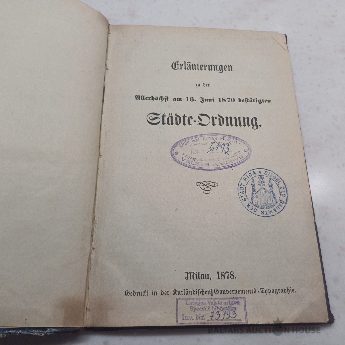 Erläuterungen zu der Allerhöchst am 16. Juni 1870 bestätigten. Städte-Ordnung. Mitau, 1878. Gedruckt in der Kurländischen Gouvernments‐Typographie. / Ar zīmogiem. Pusādas sējums ar marmorētiem vākiem. Skatīt bildēs