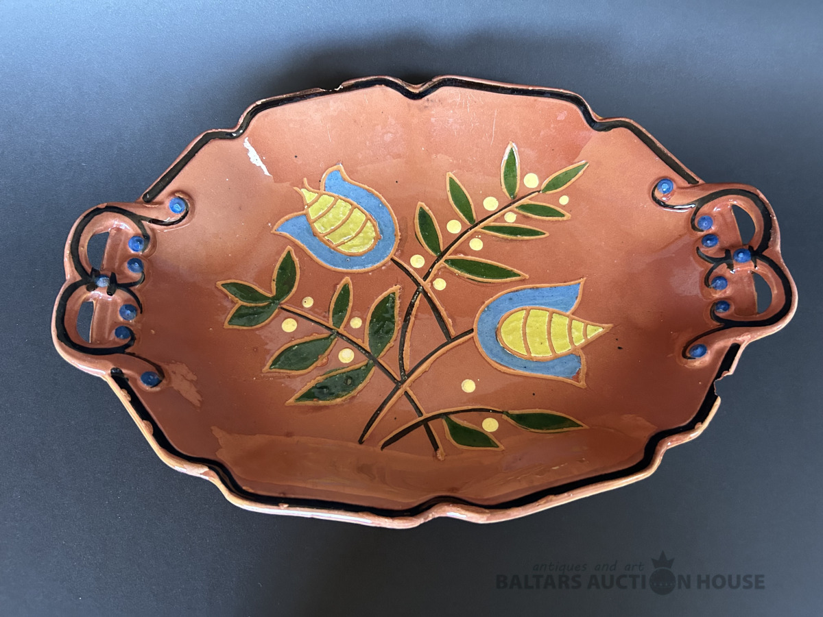 Siera dēlis, fajanss,rokas gleznojums, Polija, Wloclawek fajanss,20 g. 60. gadi ,22.5*12.5 cm, Uz vidējā, un malējā izciļņa trūkst glazūras