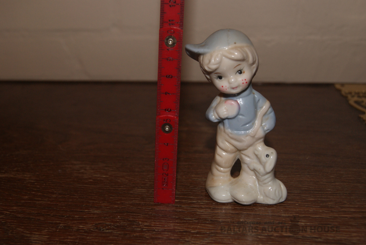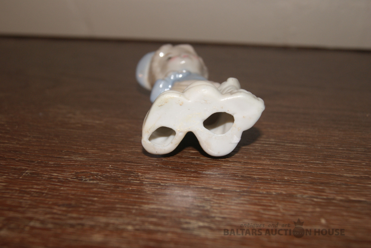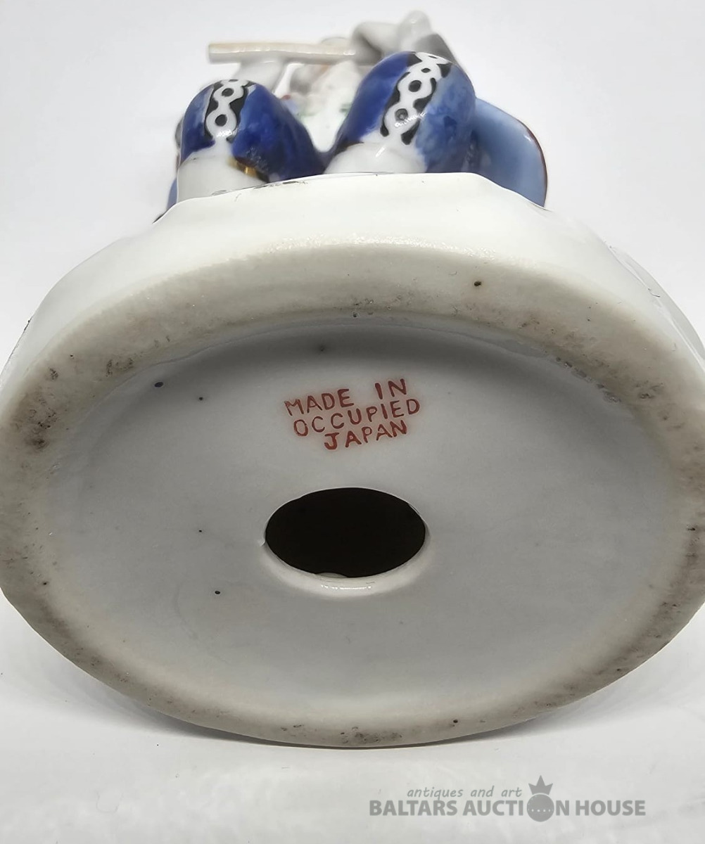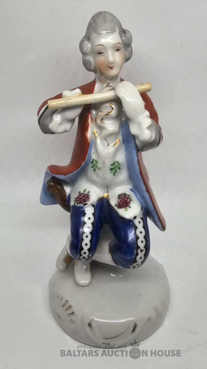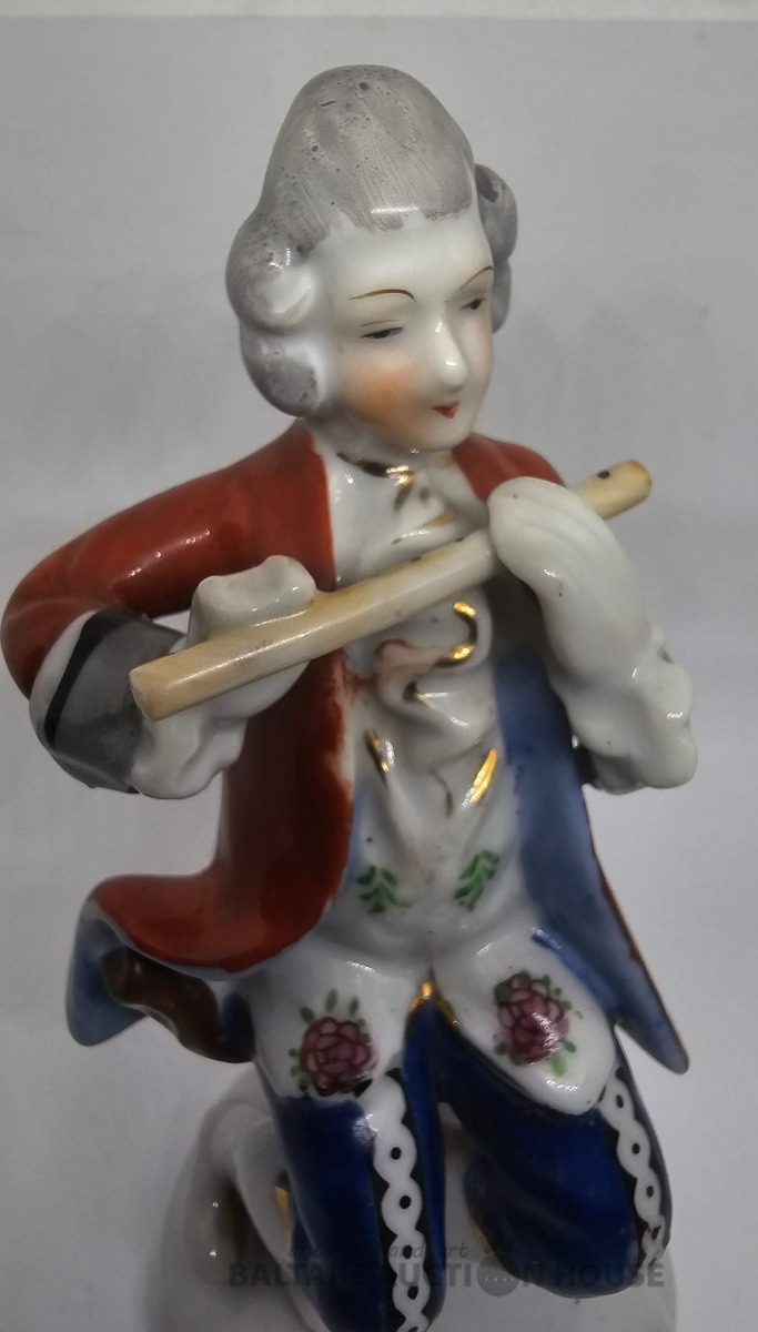 Statuete "Mūziķis ar flautu", Flautists Viktorijas laika stila tērpā, Augstums 15 cm, Rokas gleznojums, apt. 1945.–1953. gadu (okupētā Japāna)