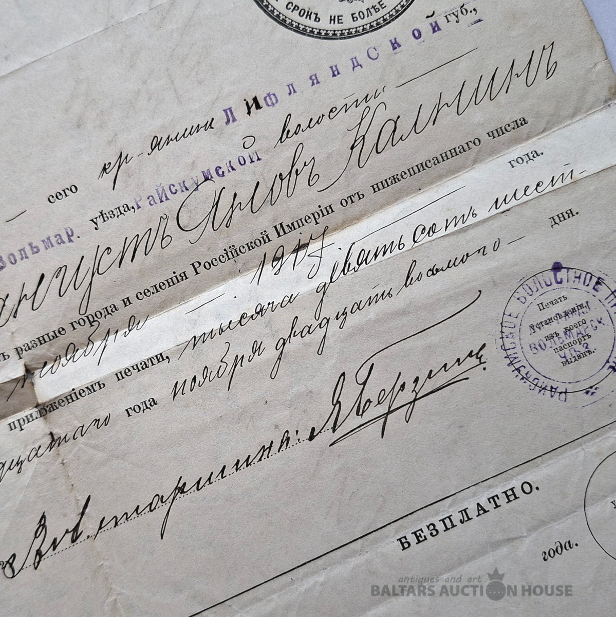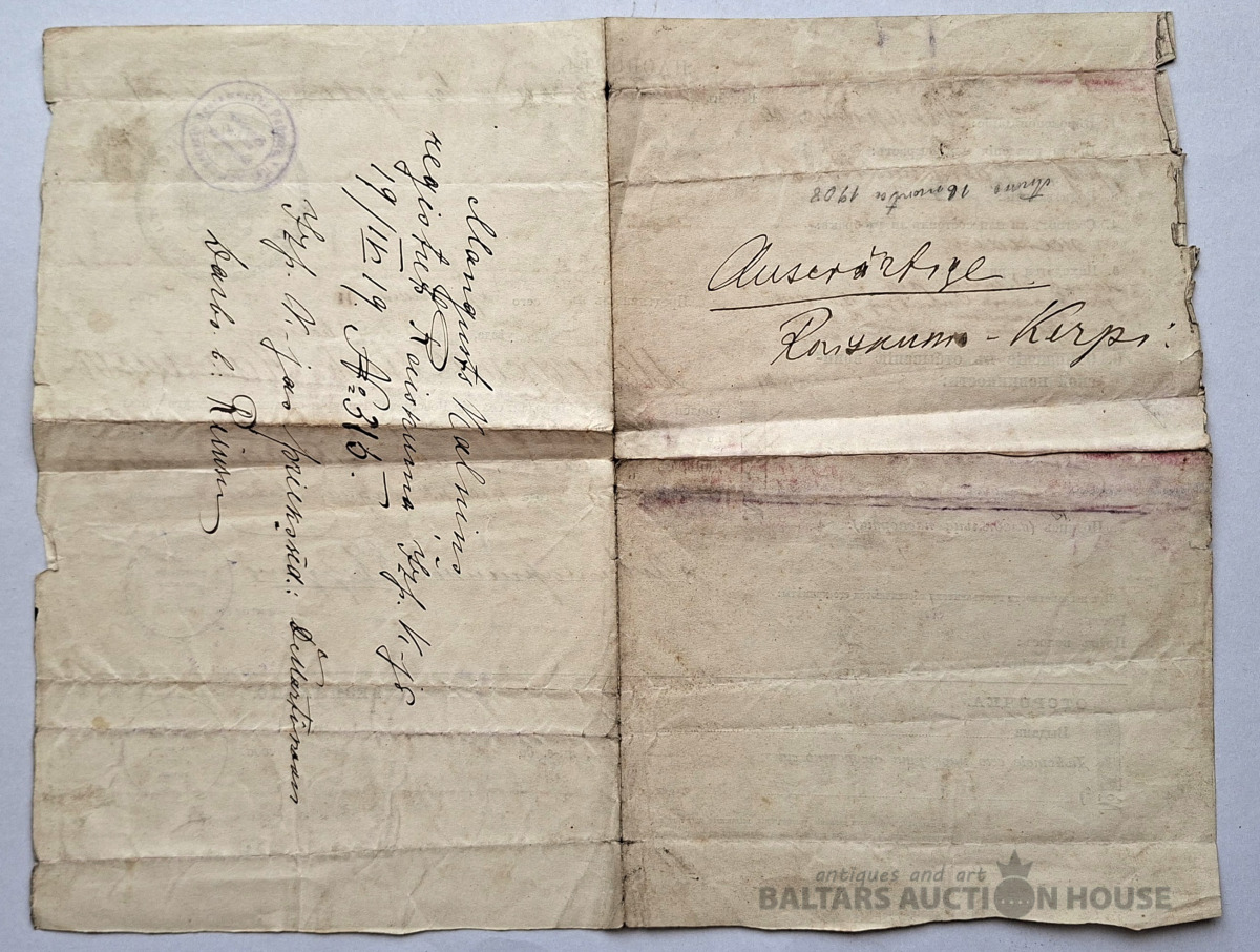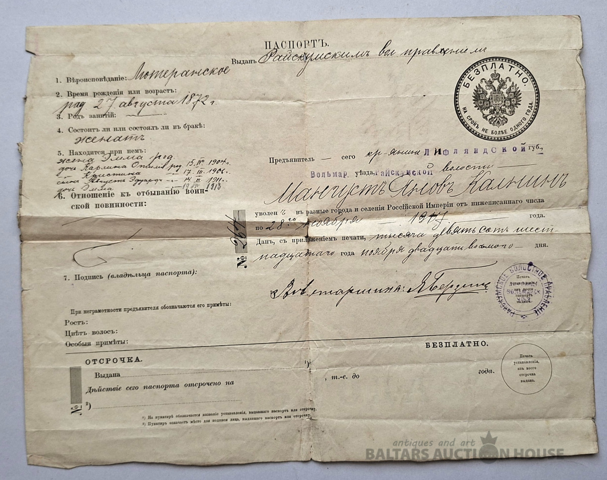 Sena pase (vai drīzāk pases grāmatiņa), kas izdota Krievijas impērijā 1916. gadā. Šis ir vērtīgs vēsturisks dokuments, kurā ir detalizēta informācija par personu. Šeit ir šī dokumenta galveno datu transkripts: Pamatinformācija Īpašnieka vārds: Magnusts Jakovļevičs Kalnins (rakstīts kā Magnusts Jakovs Kalnins). Šķira un izcelsme: Zemnieks no Livonijas guberņas, Volmarskas rajona, Raiskuma pagasta. Reliģija: Luterāņu. Dzimšanas datums: 1872. gada 27. augusts. Ģimenes stāvoklis: Precējies/precējusies