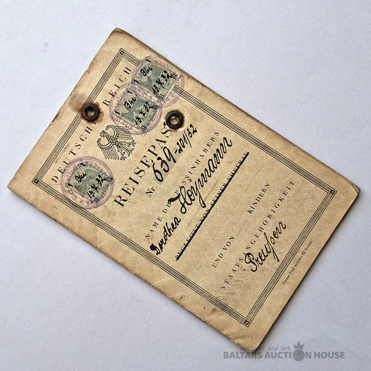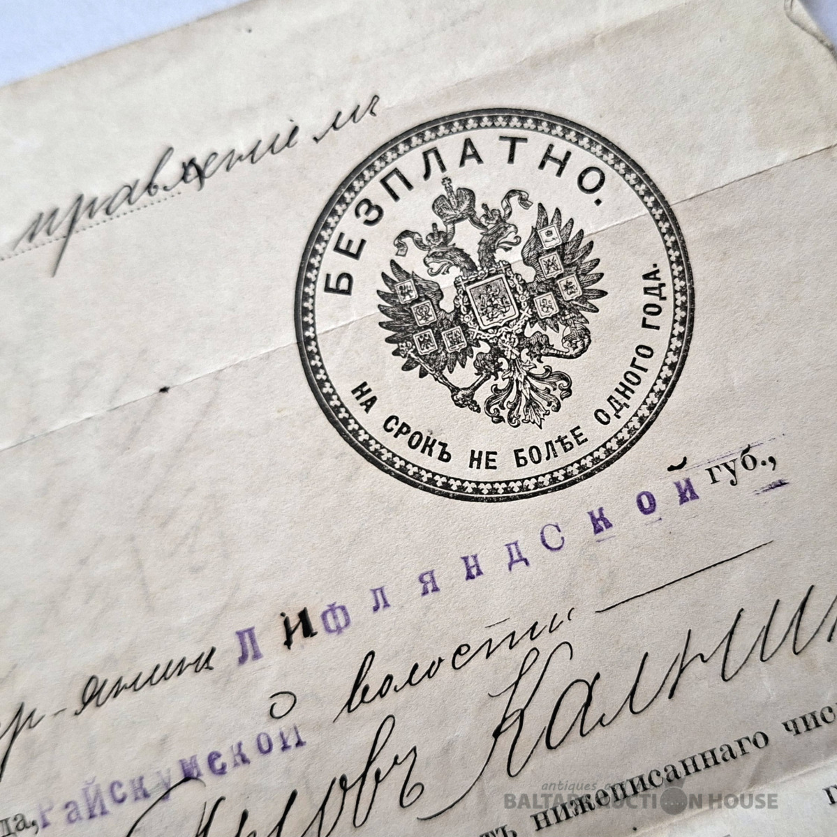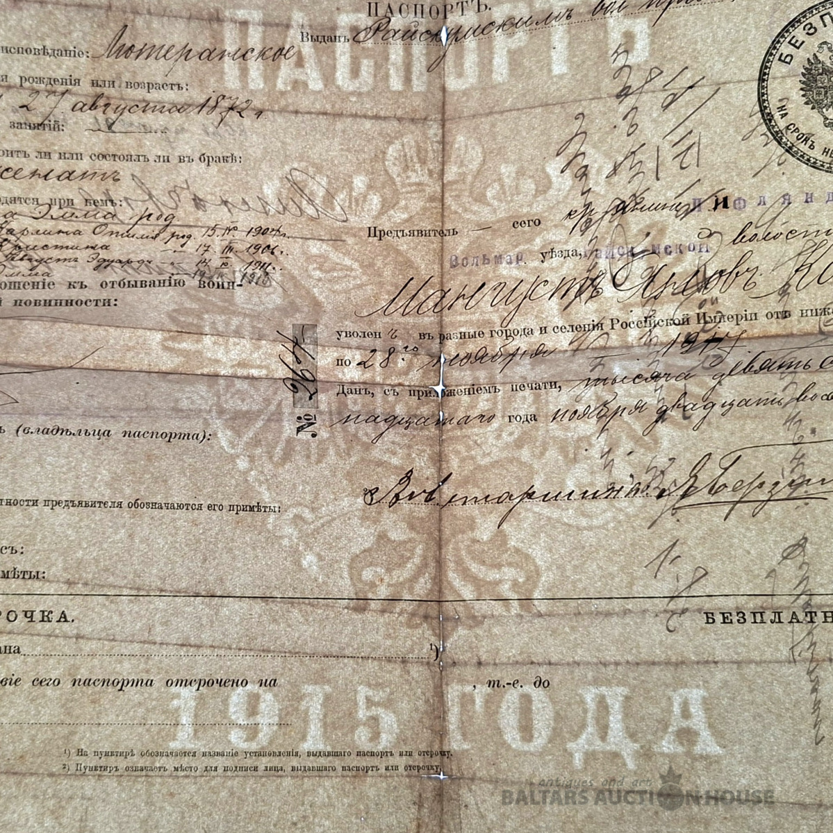Sena pase (vai drīzāk pases grāmatiņa), kas izdota Krievijas impērijā 1916. gadā. Šis ir vērtīgs vēsturisks dokuments, kurā ir detalizēta informācija par personu. Šeit ir šī dokumenta galveno datu transkripts: Pamatinformācija Īpašnieka vārds: Magnusts Jakovļevičs Kalnins (rakstīts kā Magnusts Jakovs Kalnins). Šķira un izcelsme: Zemnieks no Livonijas guberņas, Volmarskas rajona, Raiskuma pagasta. Reliģija: Luterāņu. Dzimšanas datums: 1872. gada 27. augusts. Ģimenes stāvoklis: Precējies/precējusies