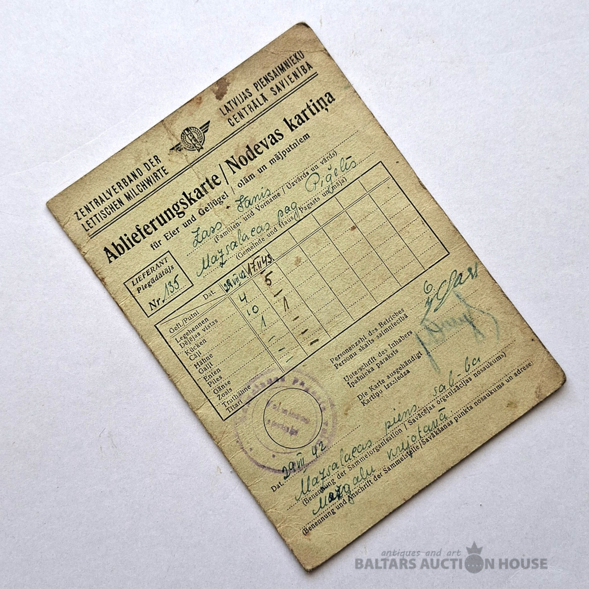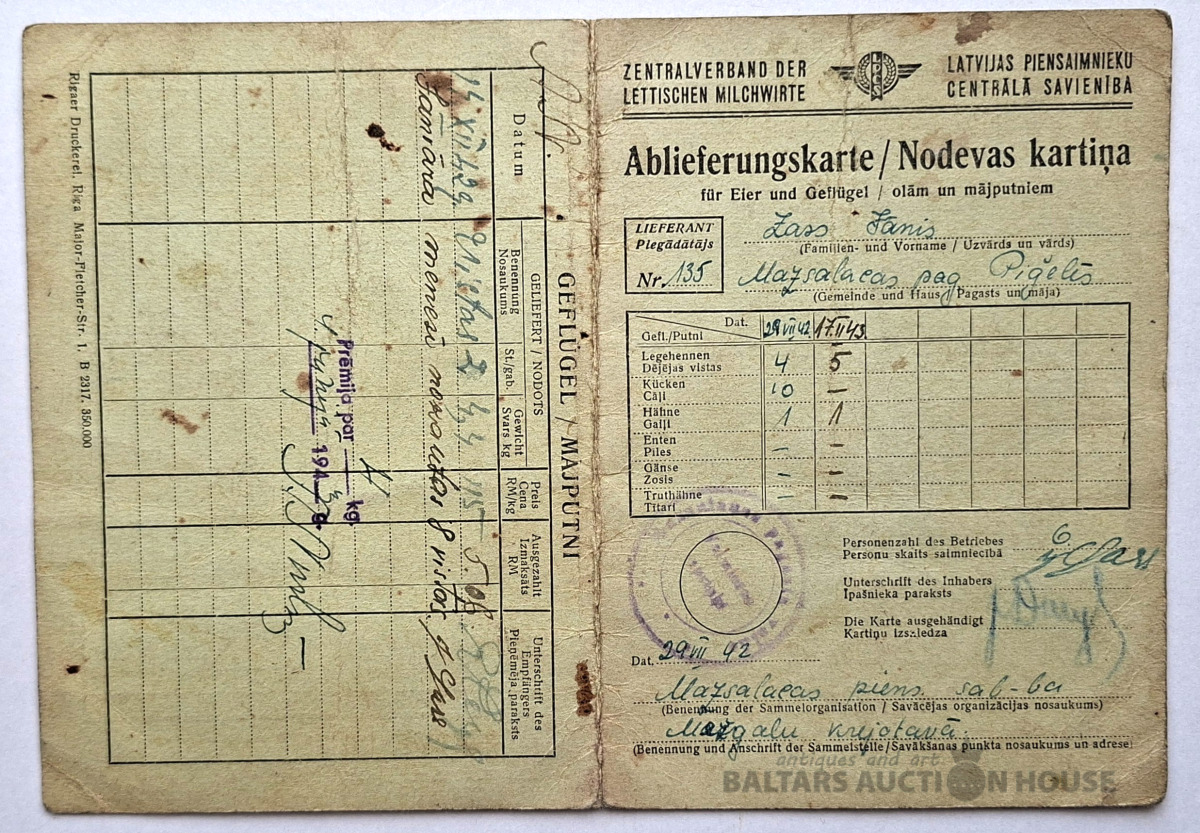 Šī prece ir sena kvīts par lauksaimniecības produktu piegādi Otrā pasaules kara laikā. Tas ir dokuments latviešu un vācu valodā, ko izdevusi Latvijas Piena lopkopju centrālā savienība (Zentralverband der lettischen Milchwirte). Kvīts apliecina olu un mājputnu piegādi no piegādātāja vārdā Fanis Zass 1942. gadā.