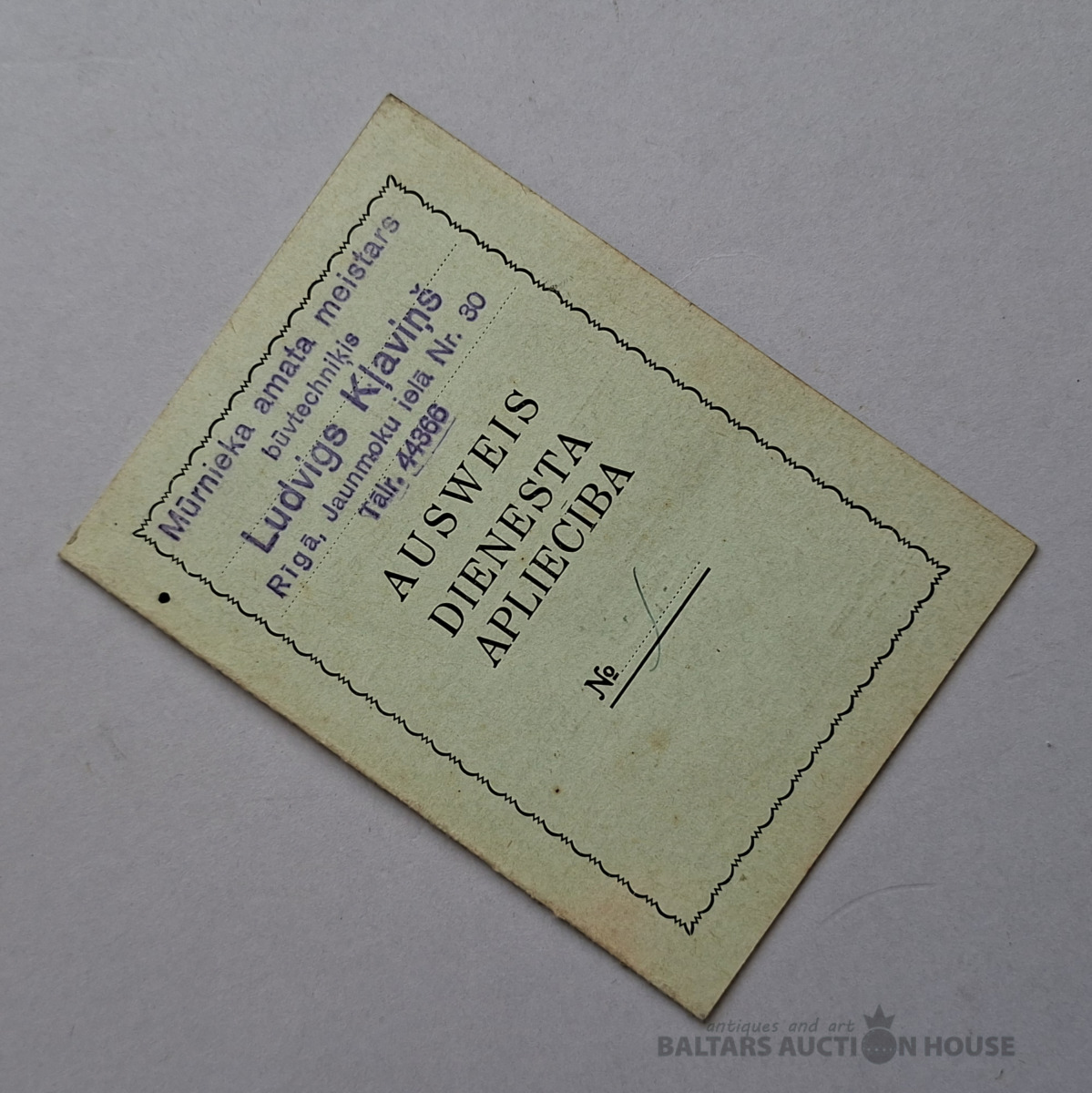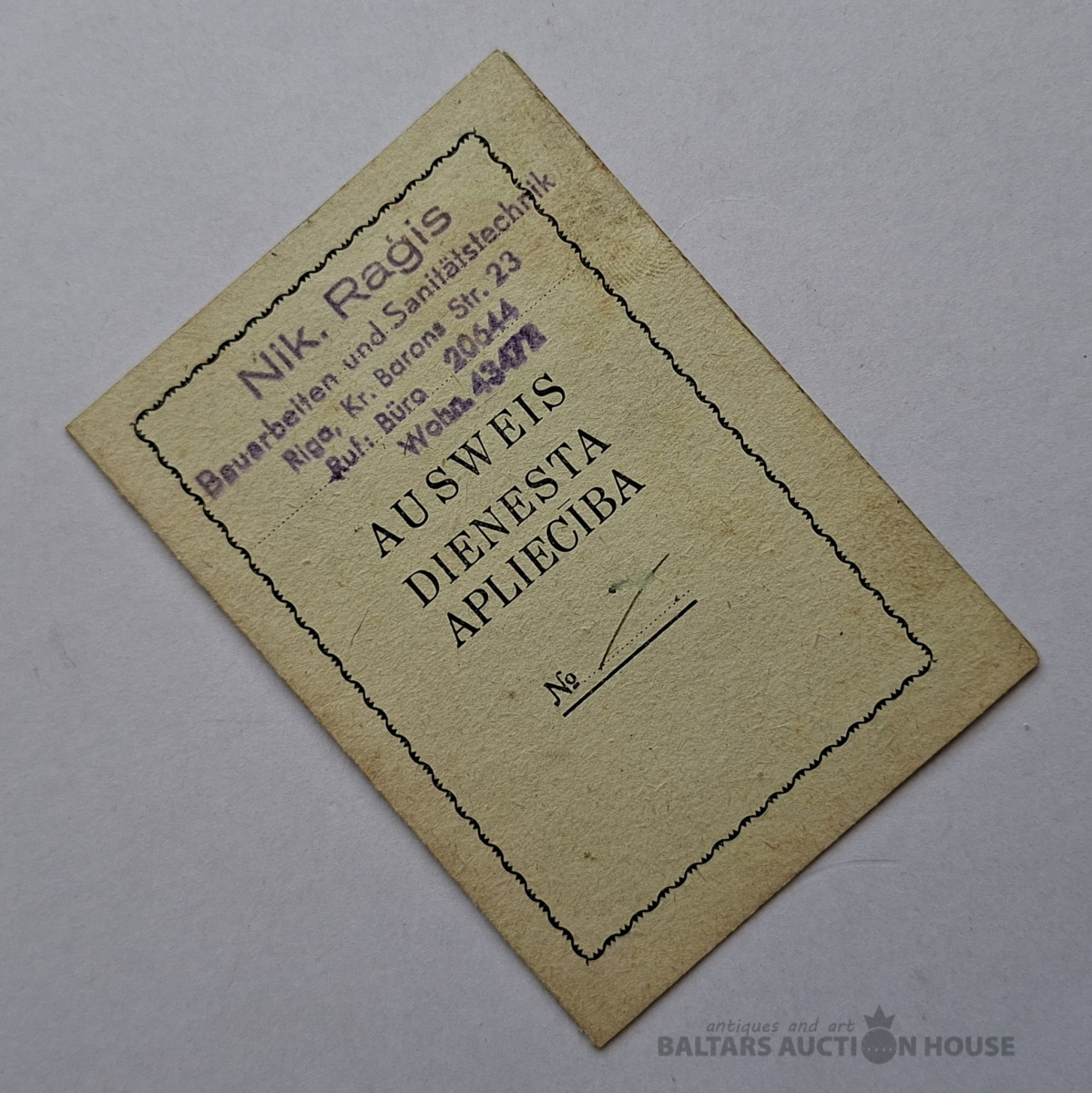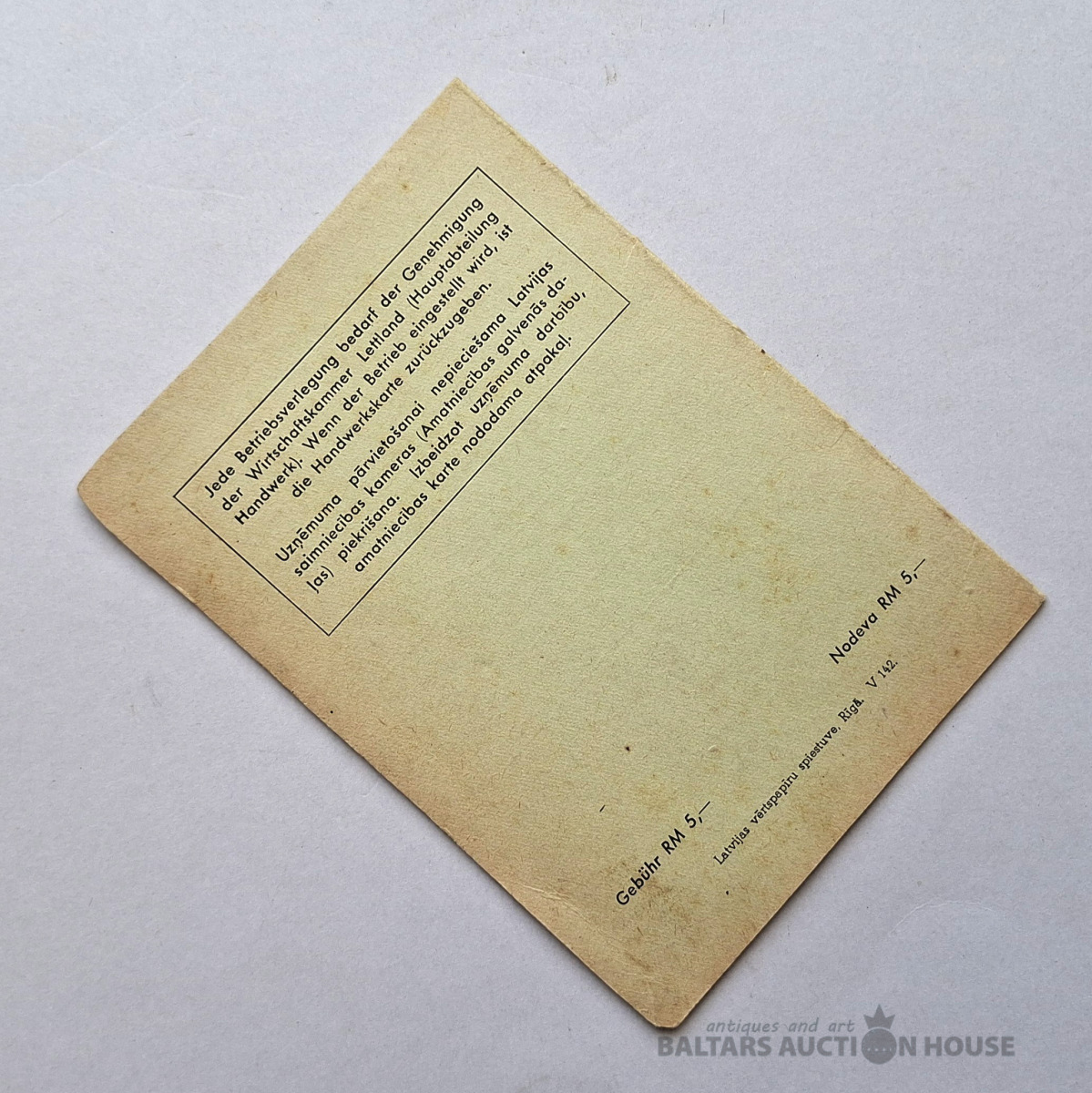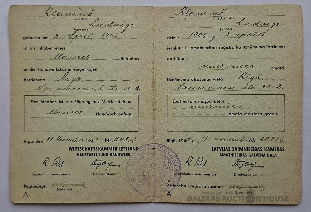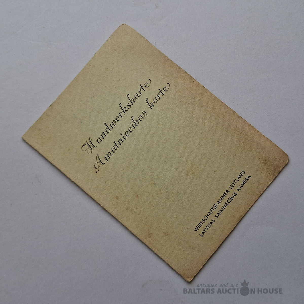 Vēsturisko amatniecības karti (Handwerkskarte / Amatniecības karte), ko izsniedz Latvijas Amatniecības kamera (Wirtschaftskammer Lettland / Latvijas Amatniecības kamera). Šis dokuments apliecina īpašnieka reģistrāciju kā amatniekam un piešķir tiesības nodarboties ar profesionālo darbību. Šādas kartes Latvijā tika izmantotas, piemēram, 20. gs. 30. gados un 40. gadu sākumā.