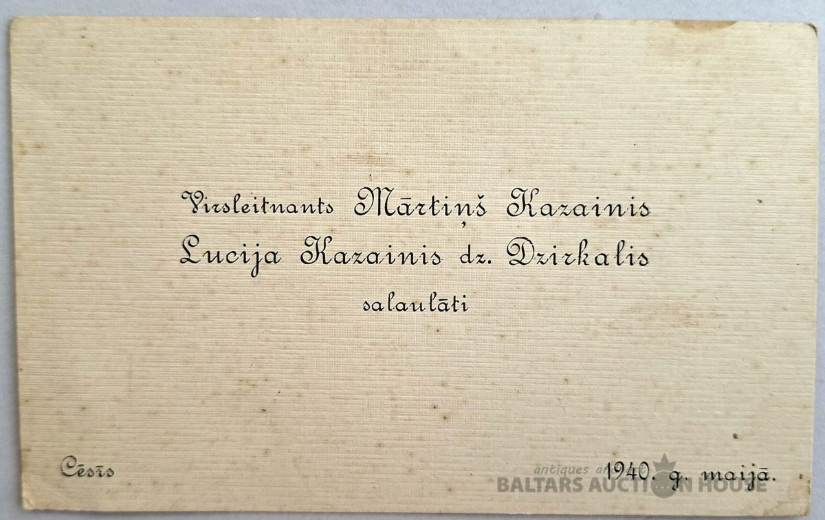 Kāzu piemiņas pastkarte vai ielūgums Latvijā. Pasākums: Kāzas (Salaulāti). Piedalās: leitnants Mārtiņš Kazainis un Lūcija Kazainis (dz. Dzirkalis). Vieta un laiks: Cēsis, 1940. gada maijs. Teksta tulkojums leitnants Mārtiņš Kazainis Lūcija Kazainis, dzimusi Dzirkalis, bija precējusies Cēsīs 1940. gada maijā.