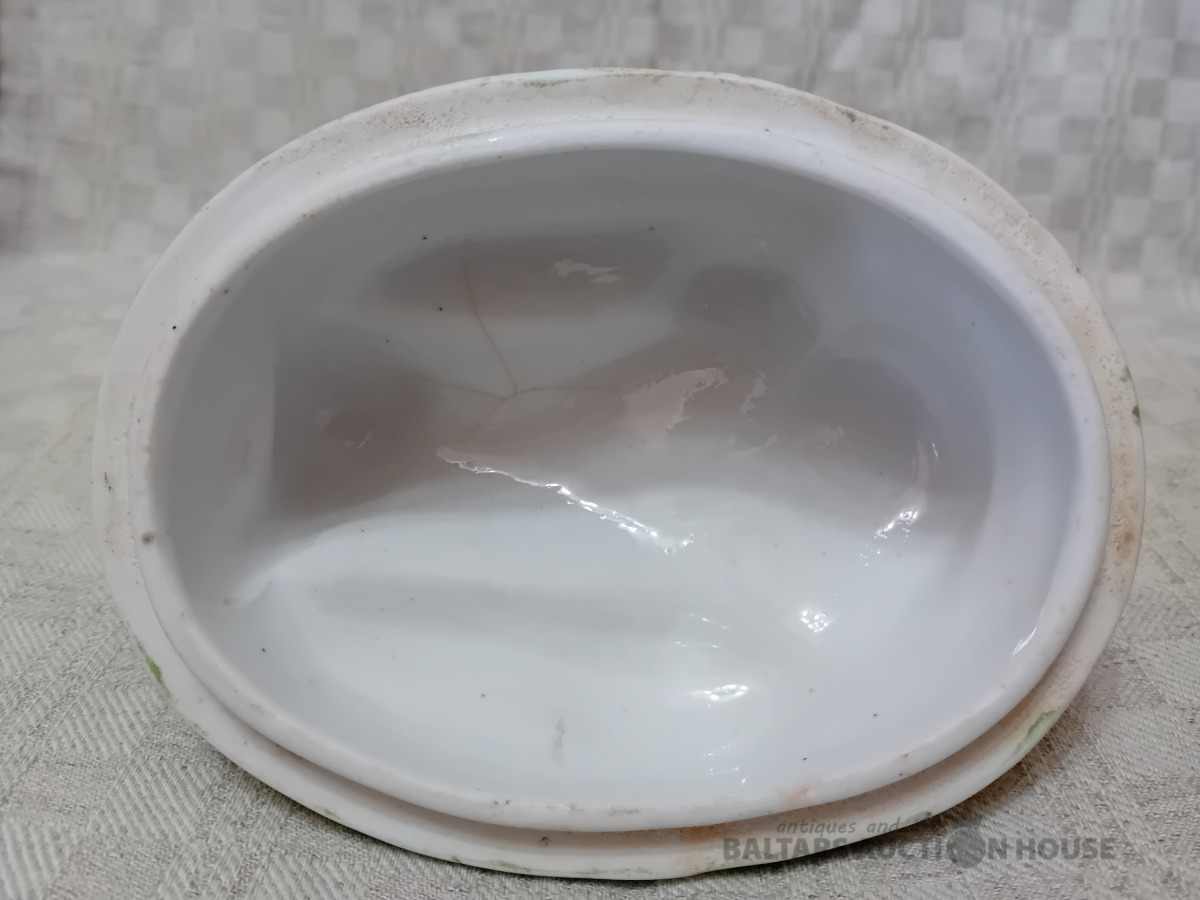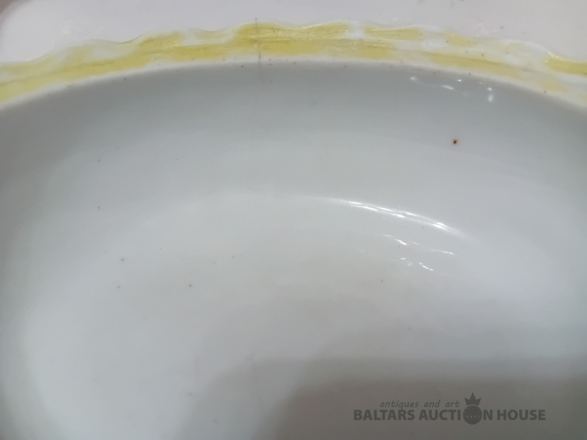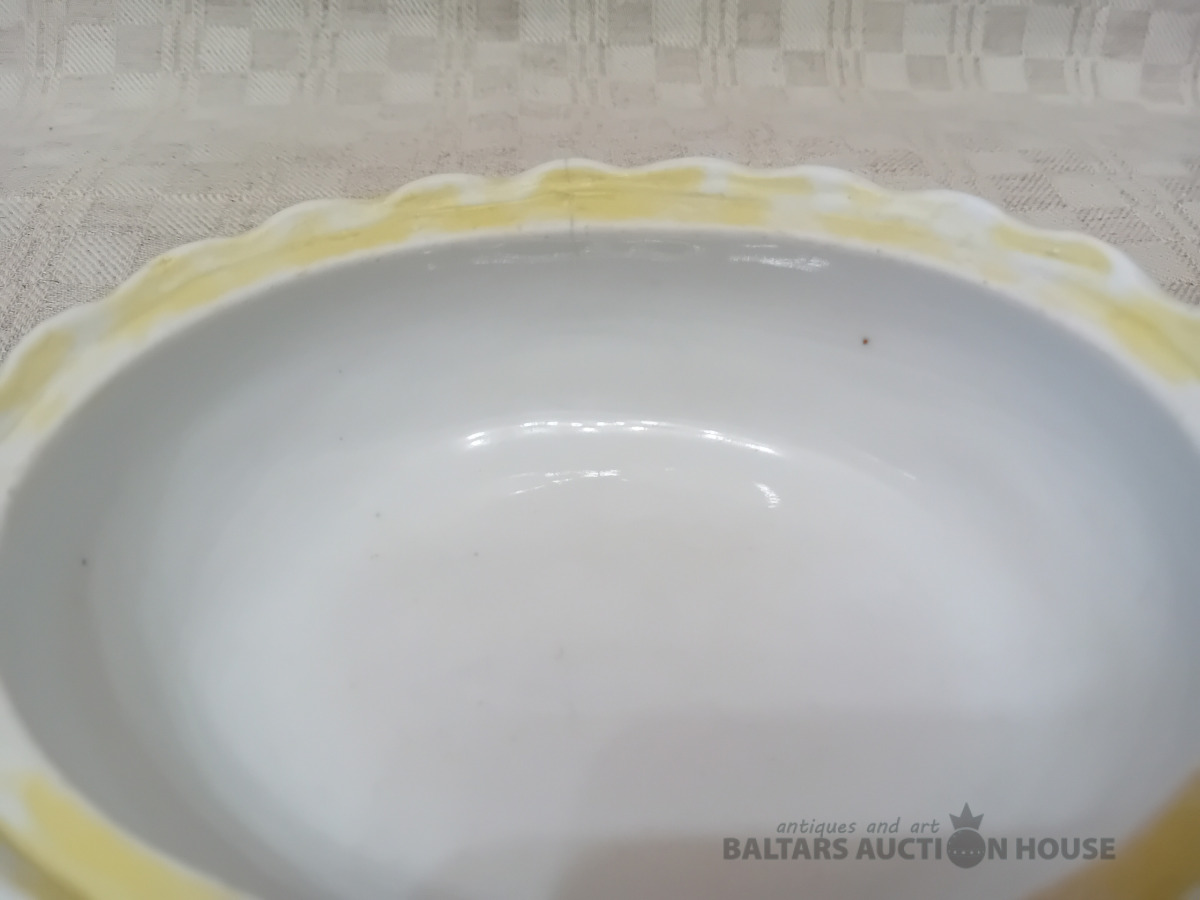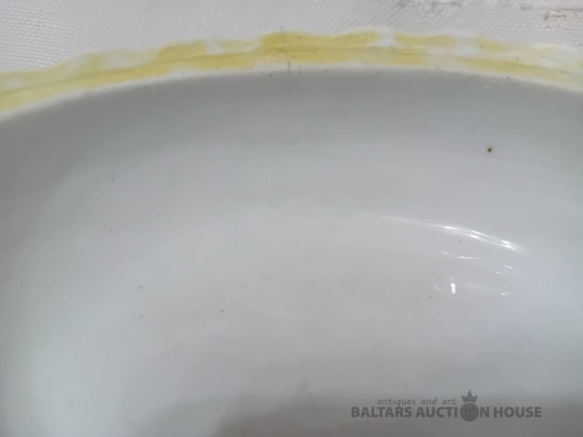 Cara laika Kuzņeovs Rīgā, sviesta trauks, pocelāns,14.5*11.5 cm, 4.5 cm h-pamatne, ir defekti, Vākam iekšpusē zirnekļa veida plaisa, kas daļēji iznāk virspusē, robs,astei glazūras atsitums, pamatnē veca plaisa, kas turpinās, kā ""svaiga""
