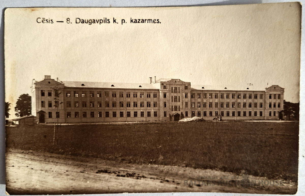 Šajā pastkartē attēlotas 8. Daugavpils kājnieku pulka kazarmas Cēsīs, Latvijā. Galvenie fakti: Ēka: Šīs ir bijušās militārās kazarmas, kas celtas 20. gadsimta sākumā (ap 1910.–1914. gadu) Krievijas impērijas armijas vajadzībām. Pulks: Latvijas neatkarības laikā (1920.–1940. gads) šeit atradās 8. Daugavpils kājnieku pulks.