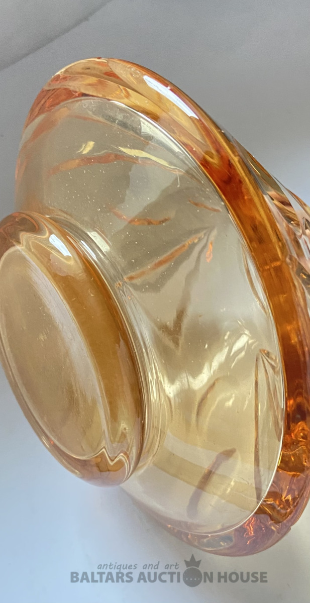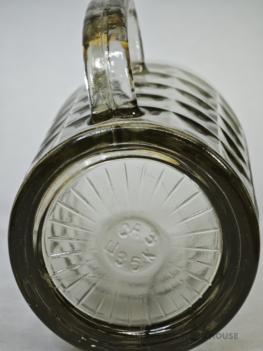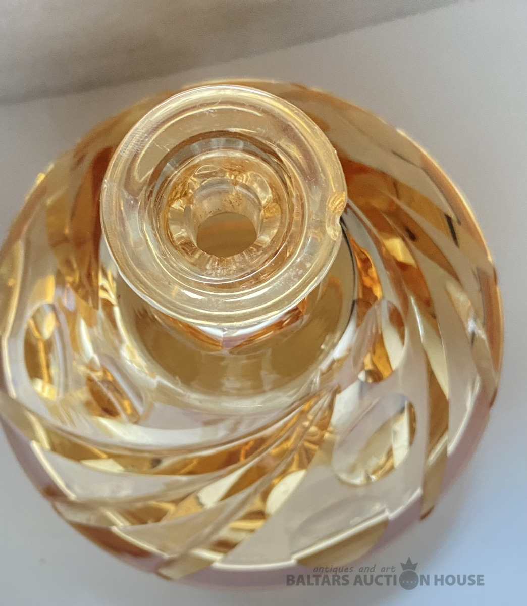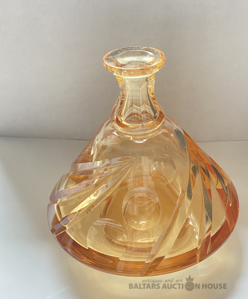 Krāsaina stikla karafe bez vāka, Iļģuciema stikla fabrika? Uz kakla ir robiņš,sk.foto 5-6; H=14,5 cm.