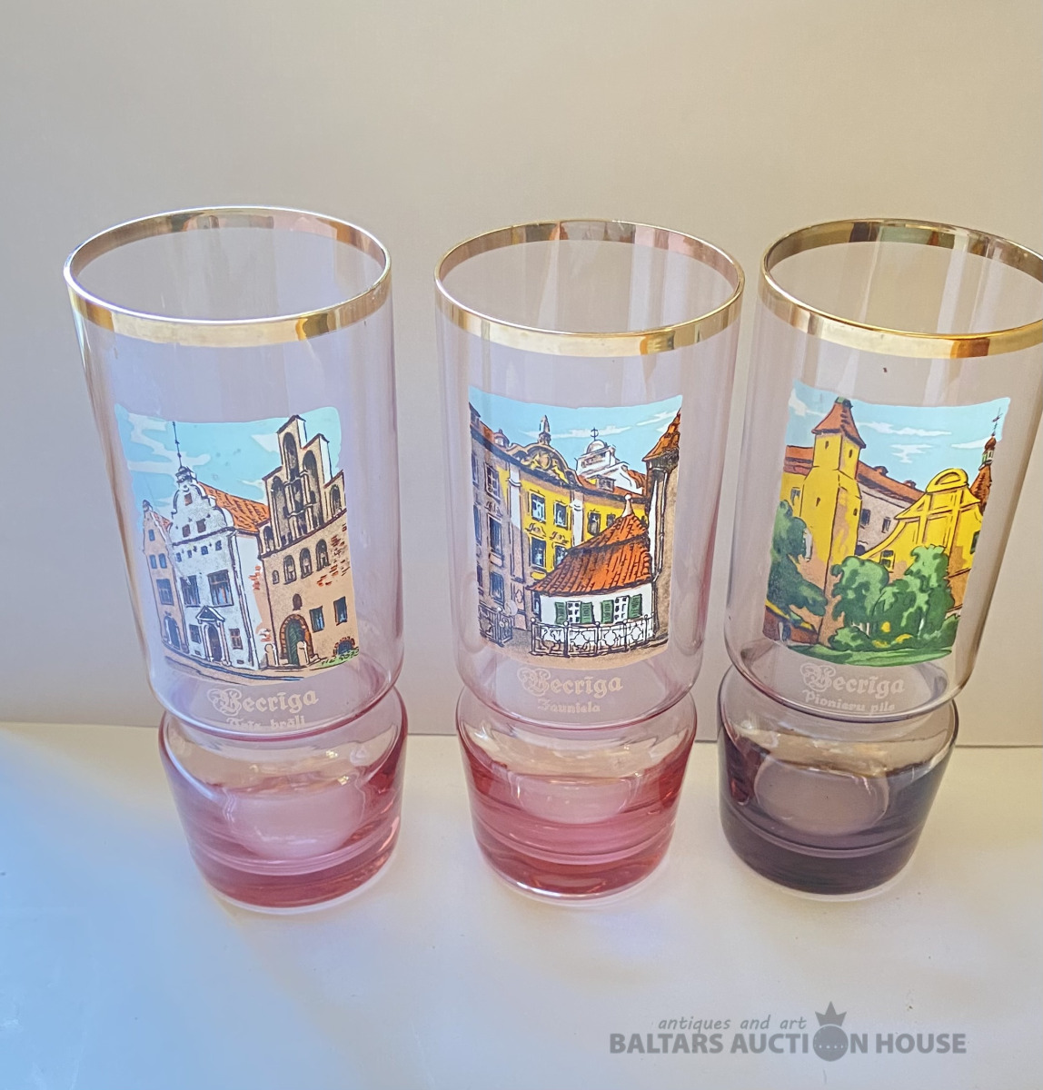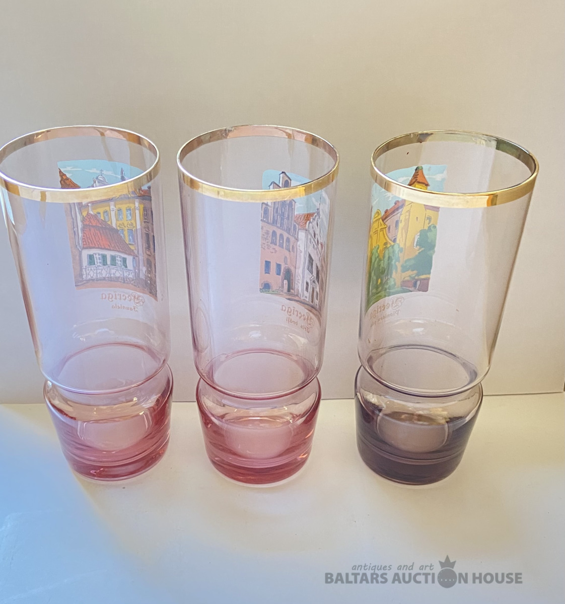 Trīs glāzes “Vecrīga” ,Latvijas stikls, vienai ir tumšāks tonis,lietošanas pazīmes . H=14,5 cm.