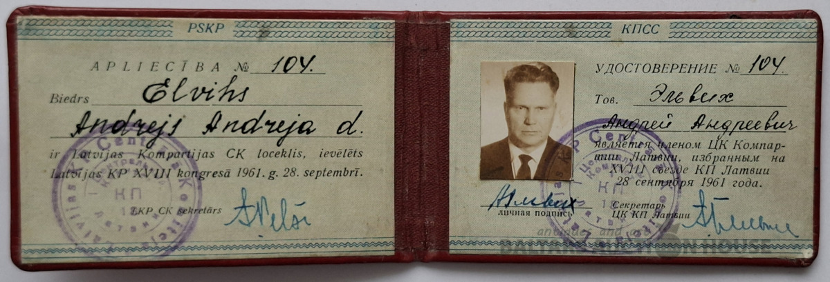 Latvijas Komunistiskās partijas Centrālkomitejas biedra karte, izsniegta biedram Elviham Andrejam, Latvijas PSR ārlietu ministram. Objekta veids: Latvijas Komunistiskās partijas Centrālkomitejas biedra karte. Īpašnieka vārds: Elvihs Andrejs. Konteksts: Dokuments apliecina viņa ievēlēšanu Latvijas Komunistiskās partijas 19. kongresā. Vēsturiskais fons: Šis ir kolekcionāra priekšmets, kas saistīts ar PSRS vēsturi un politisko darbību., 1961.