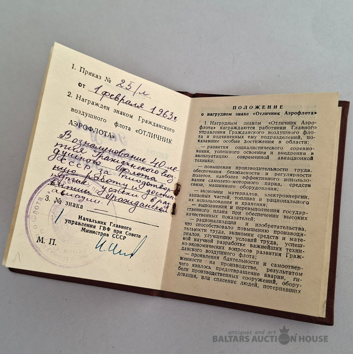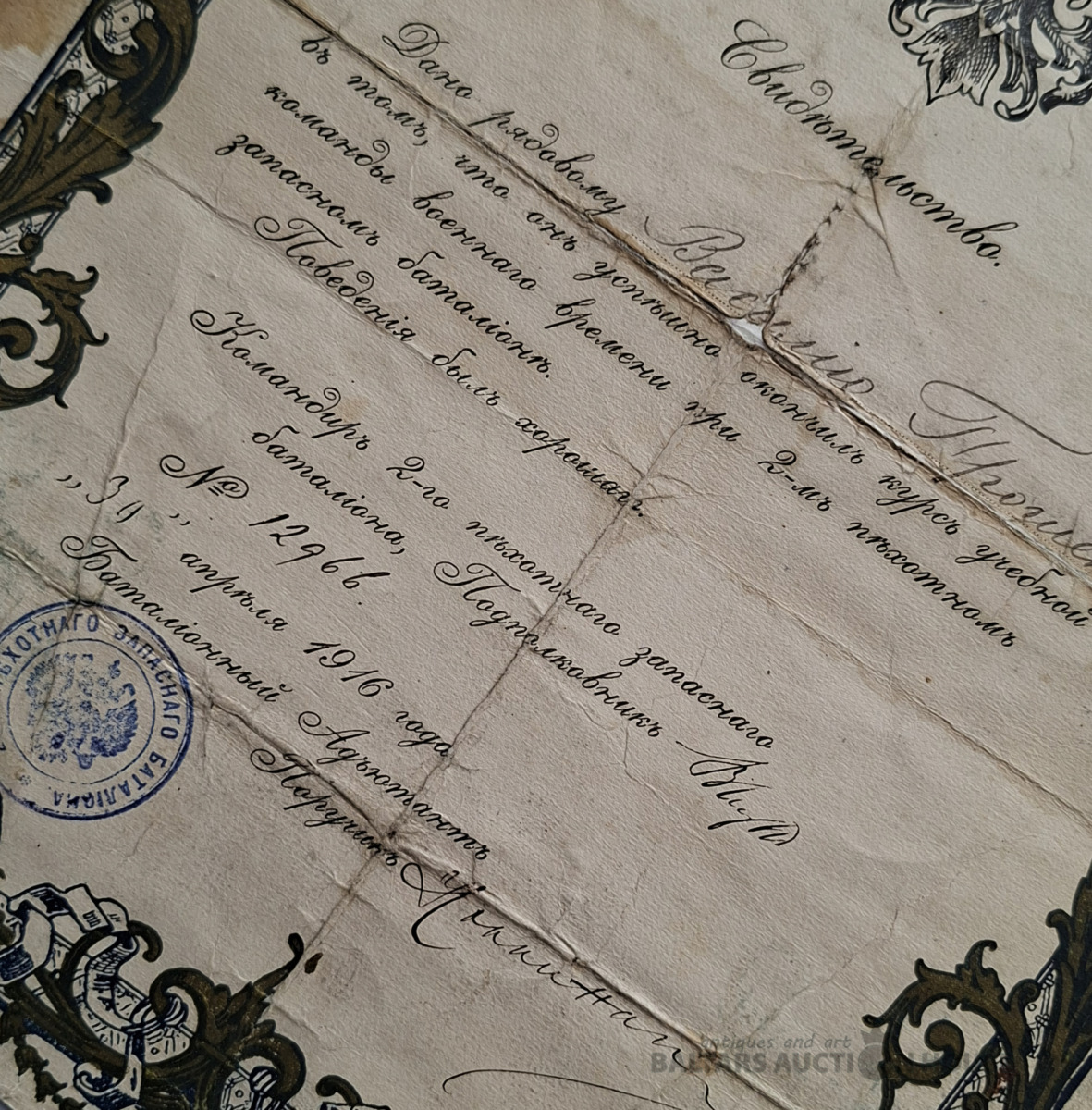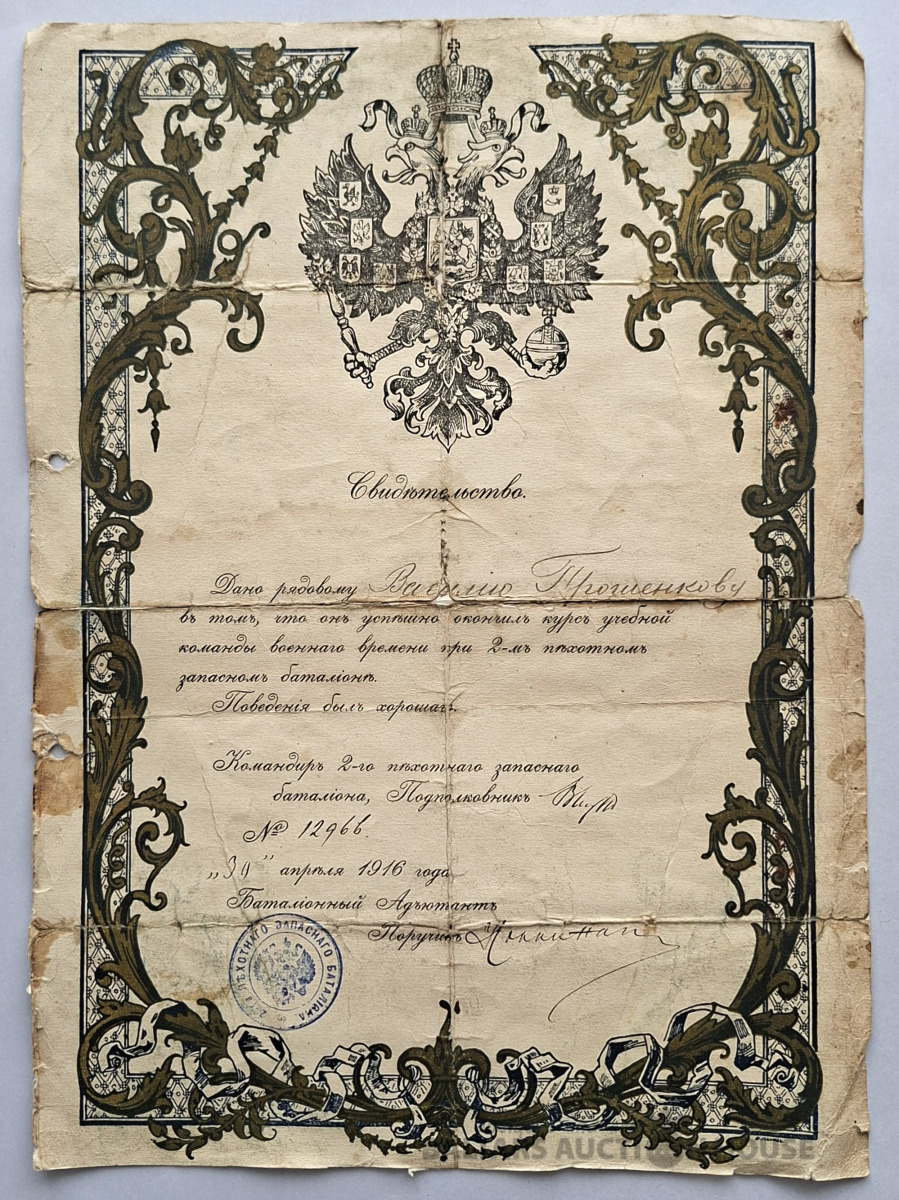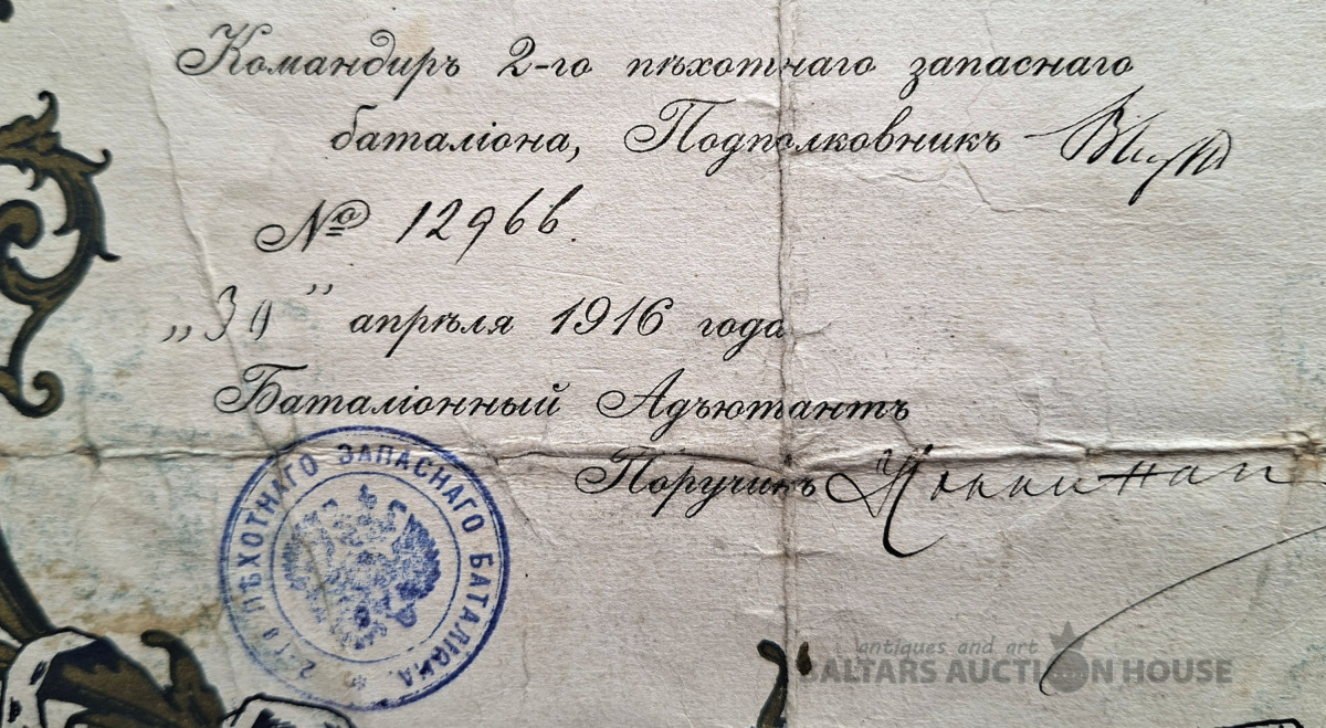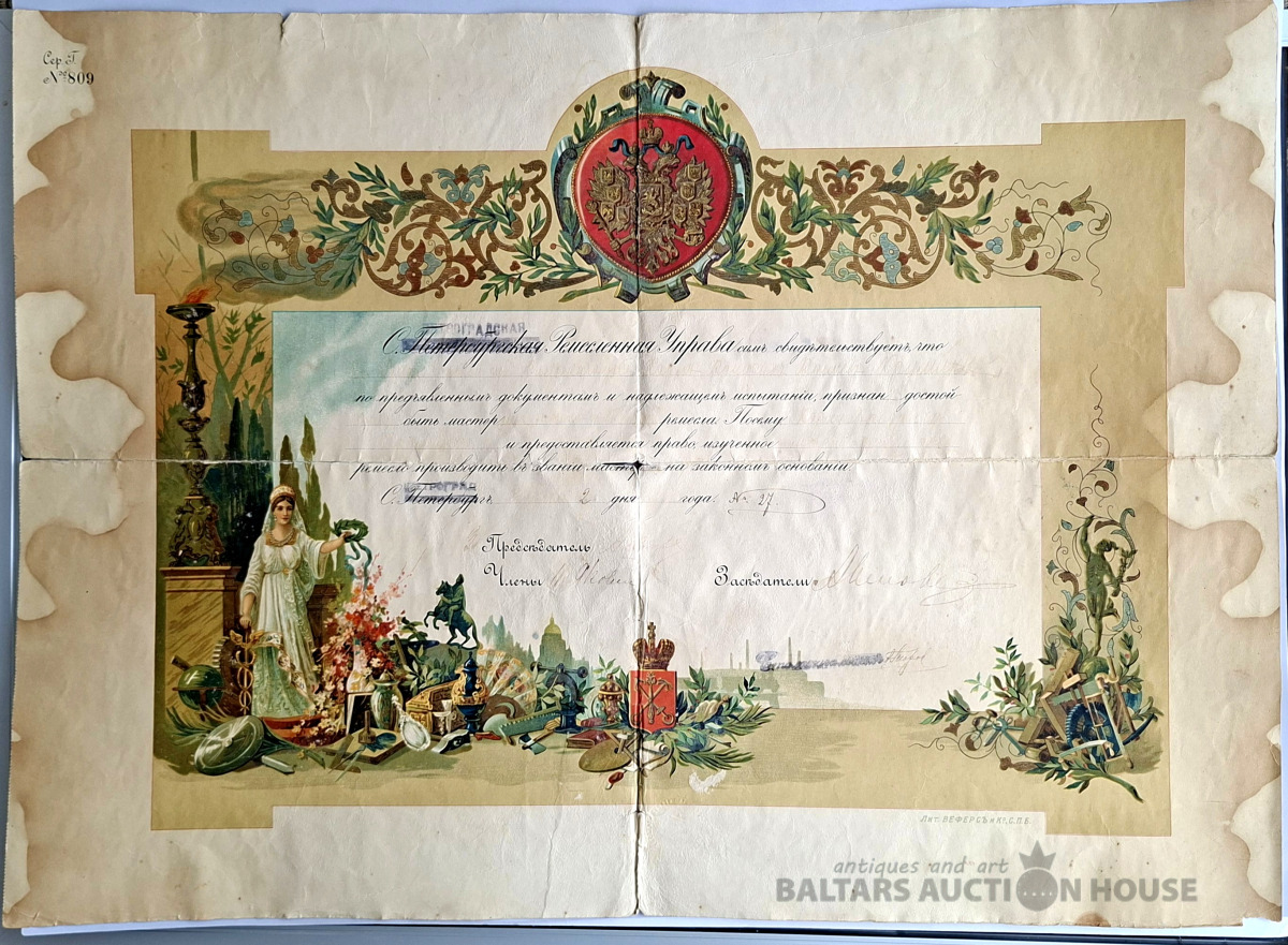 Šis priekšmets ir vēsturisks dokuments no Krievijas impērijas, acīmredzot amatnieka apliecība par meistara titula iegūšanu. Objekta veids: Antīks papīrs, vēsturisks dokuments vai harta. Saturs: Teksts apstiprina pārbaudījumu nokārtošanu un meistara titula iegūšanu, piešķirot likumīgas tiesības praktizēt amatu. Dizains: Dokuments ir dekorēts ar Krievijas impērijas valsts emblēmu (divgalvainais ērglis) un 20. gadsimta sākumam raksturīgiem mākslinieciskiem elementiem. Stāvoklis: Dokumentam ir redzamas vecuma pazīmes, tostarp locījuma radītas krokas.