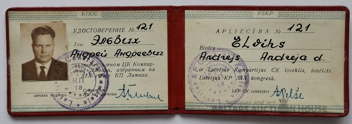 Latvijas Komunistiskās partijas Centrālkomitejas biedra karte, izsniegta biedram Elviham Andrejam, Latvijas PSR ārlietu ministram. Objekta veids: Latvijas Komunistiskās partijas Centrālkomitejas biedra karte. Īpašnieka vārds: Elvihs Andrejs. Konteksts: Dokuments apliecina viņa ievēlēšanu Latvijas Komunistiskās partijas 19. kongresā. Vēsturiskais fons: Šis ir kolekcionāra priekšmets, kas saistīts ar PSRS vēsturi un politisko darbību.