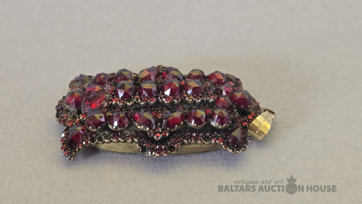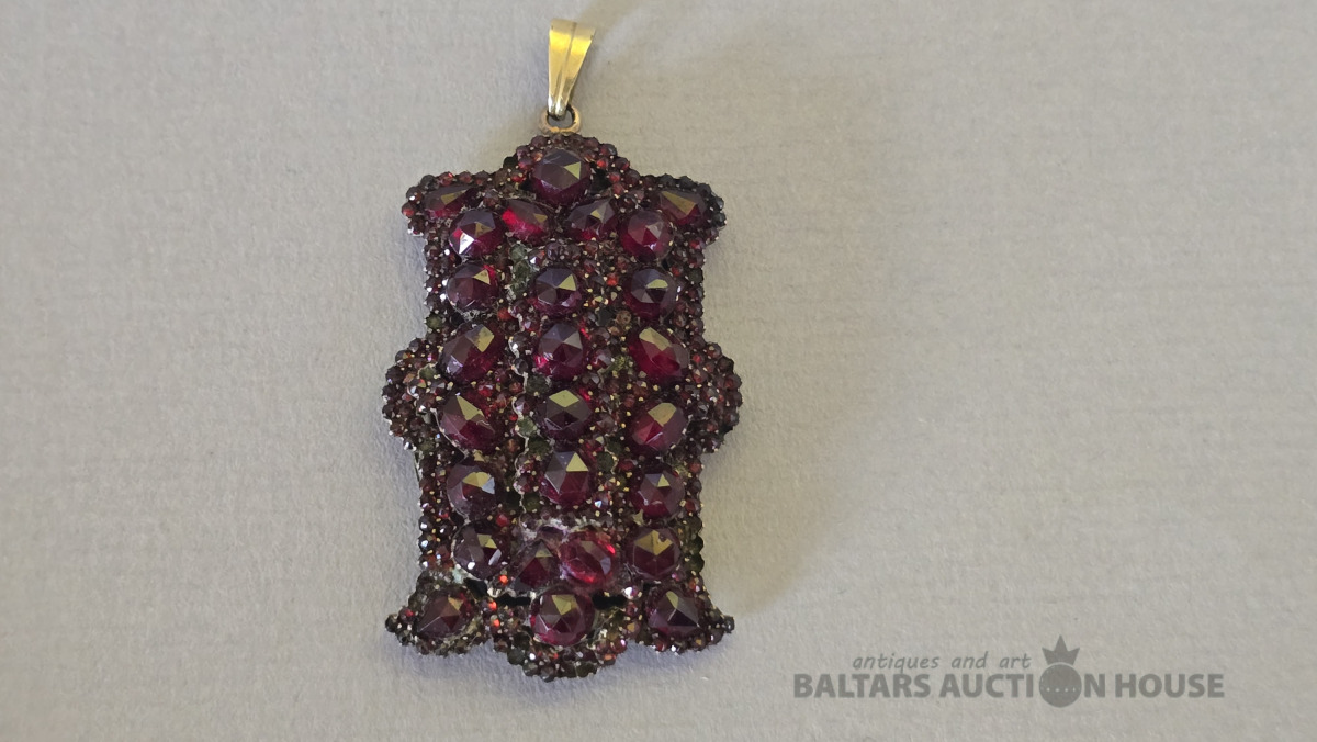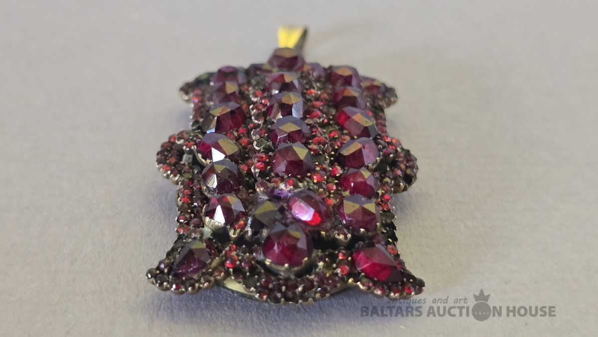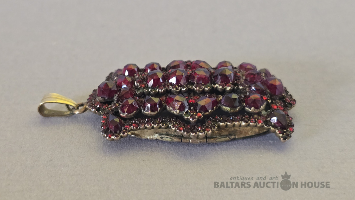 Autordarbs. Iespaidīgs, bagātīgi dekorēts kulons, kas inkrustēts lielākiem un mazākiem granātiem, kuri blīvi aizpilda kulona virsmu. Tas aizmugurē atveras kā glabātuve. Rets un labi saglabājies 19. gadsimta beigu rotaslietu paraugs.