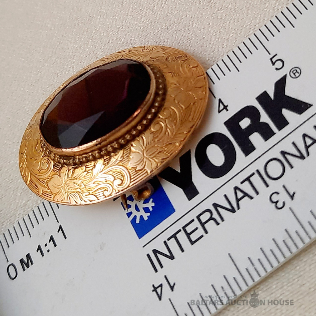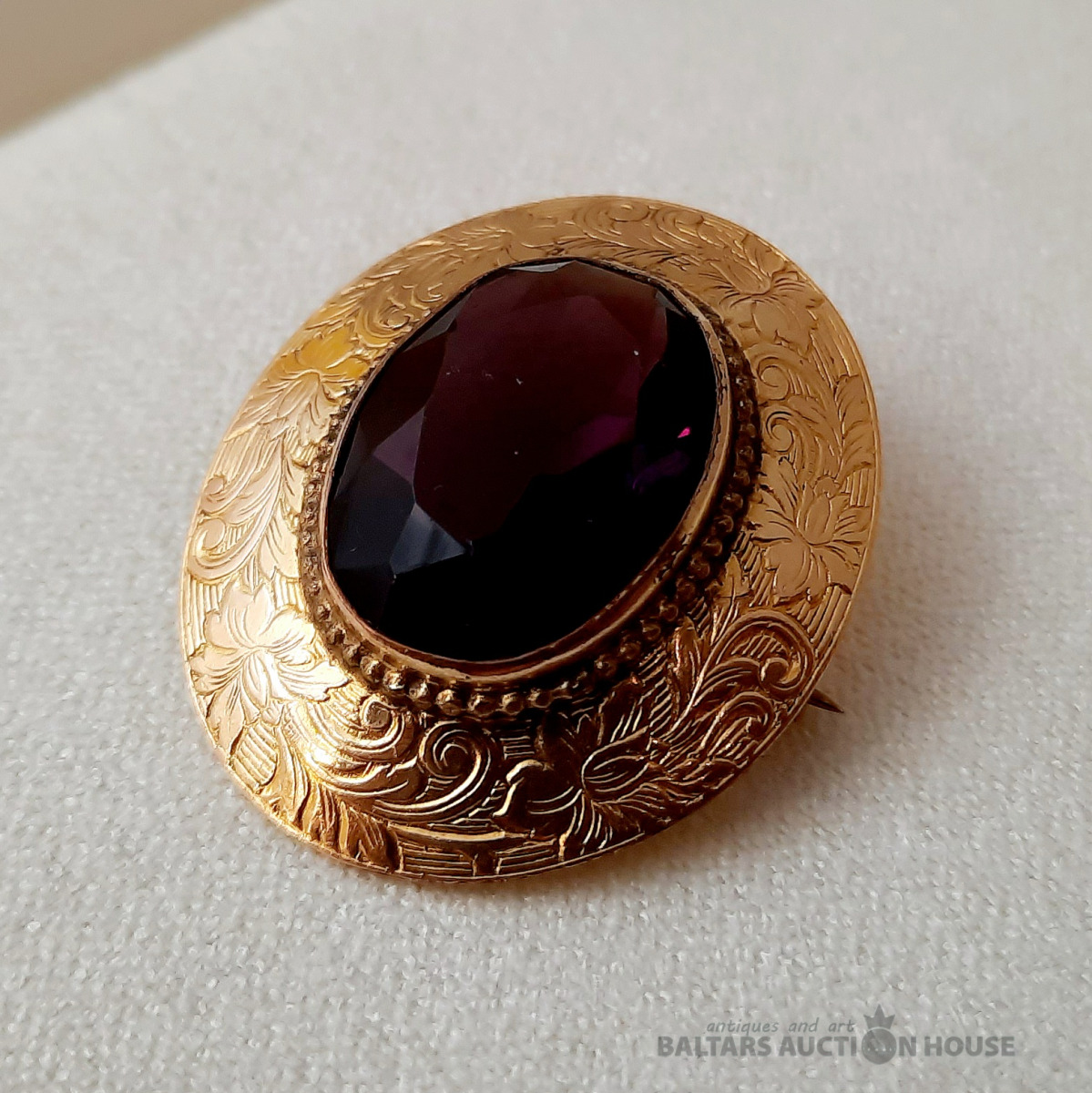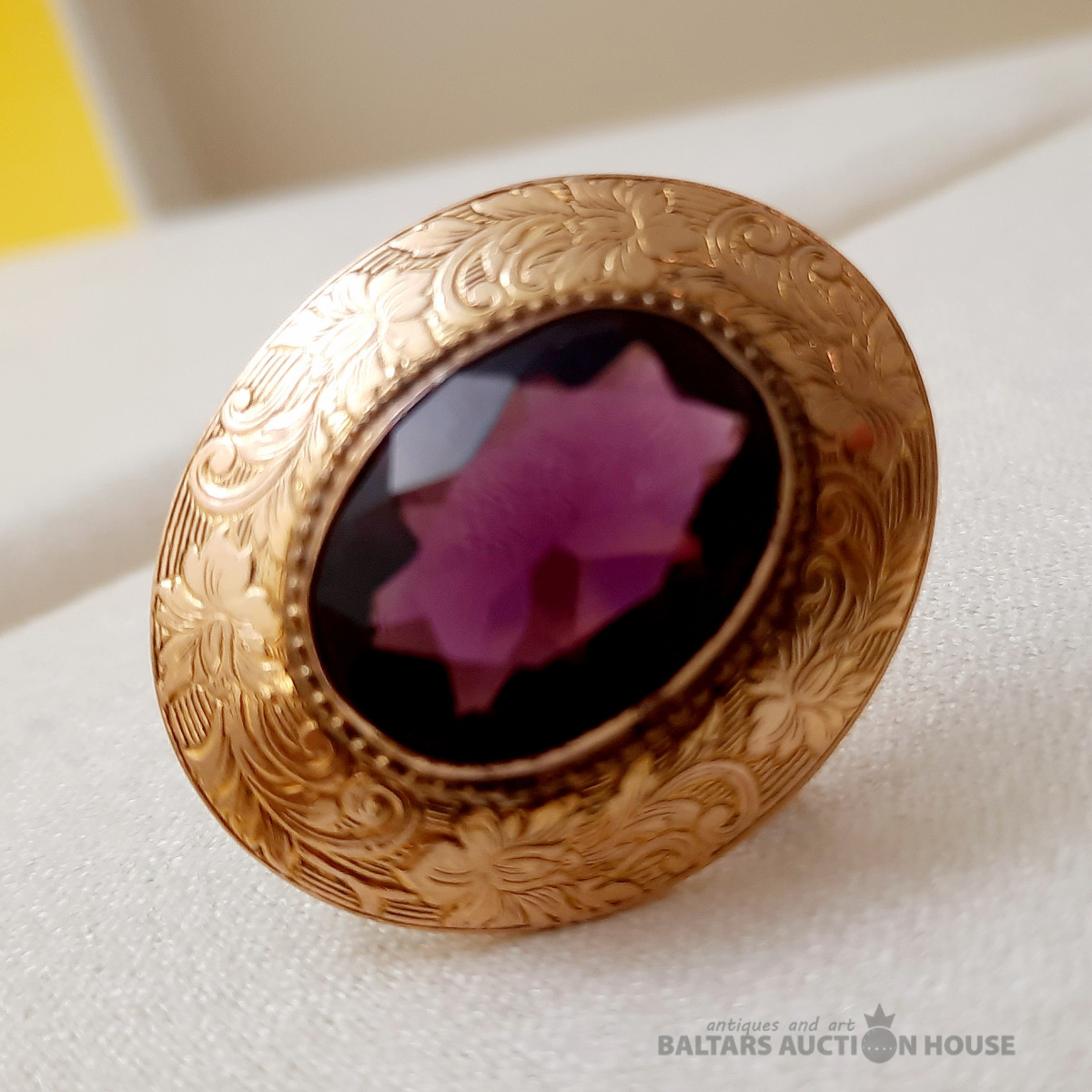 Autordarbs. Iespaidīgs, bagātīgi dekorēts kulons, kas inkrustēts lielākiem un mazākiem granātiem, kuri blīvi aizpilda kulona virsmu. Tas aizmugurē atveras kā glabātuve. Rets un labi saglabājies 19. gadsimta beigu rotaslietu paraugs.