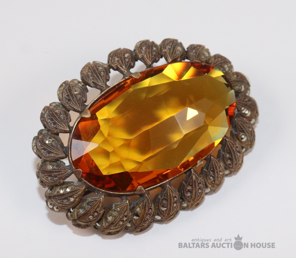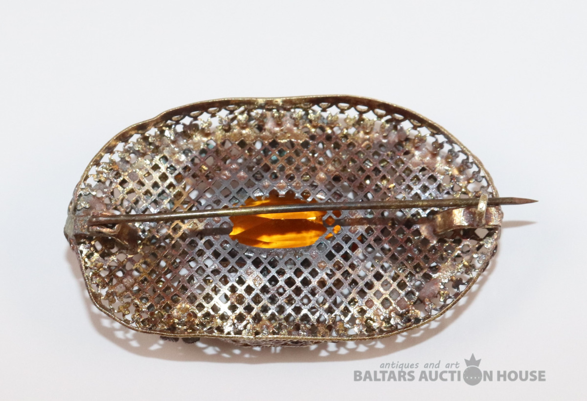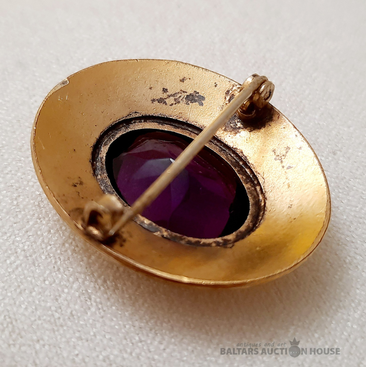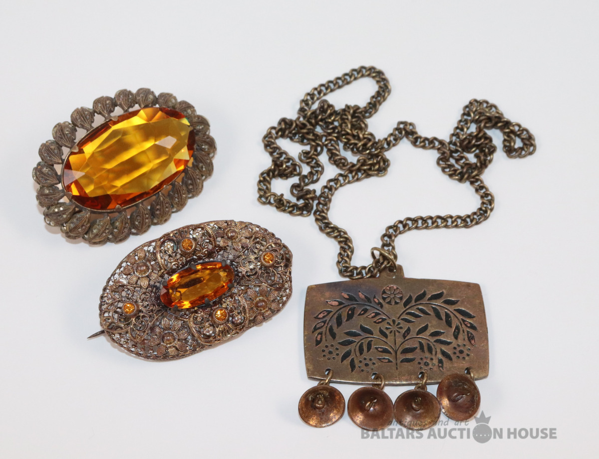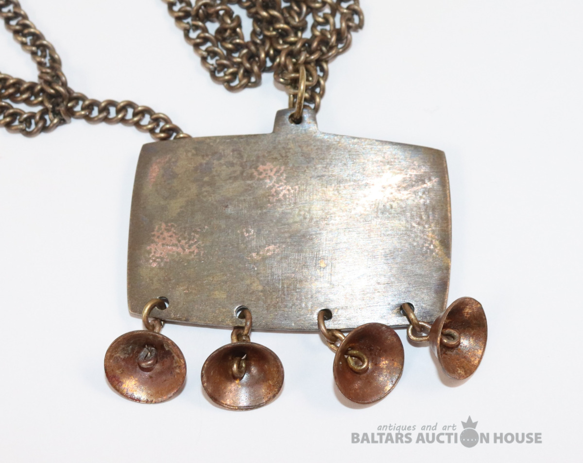 Brošas 2 gab. un kaklarota. Brošas 3,8x5,3 cm, 3,2x5,4 cm. Kaklarotas ķēdes garums 63 cm, piekariņš 5x4,7 cm