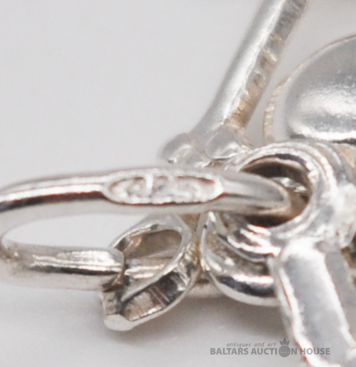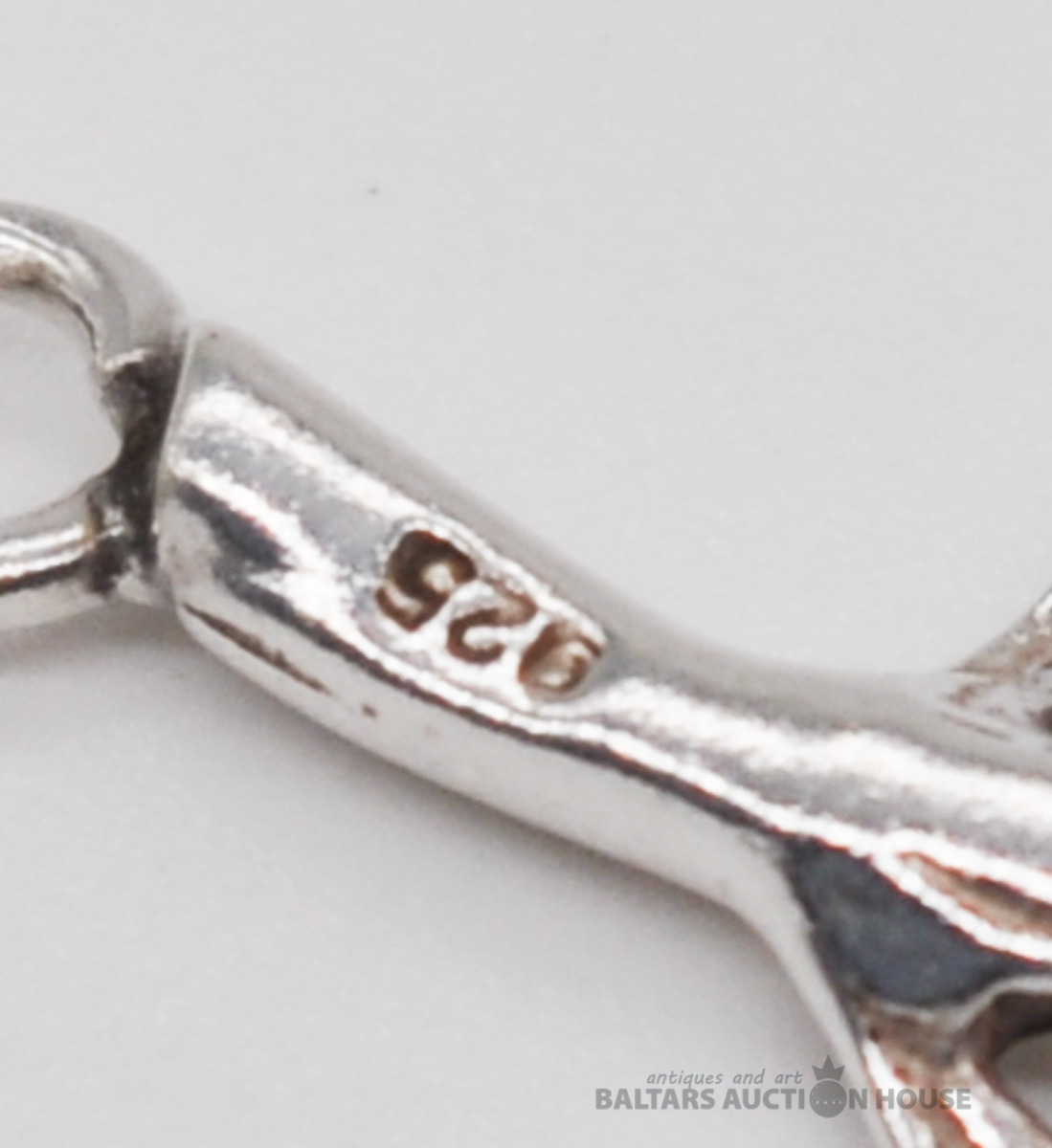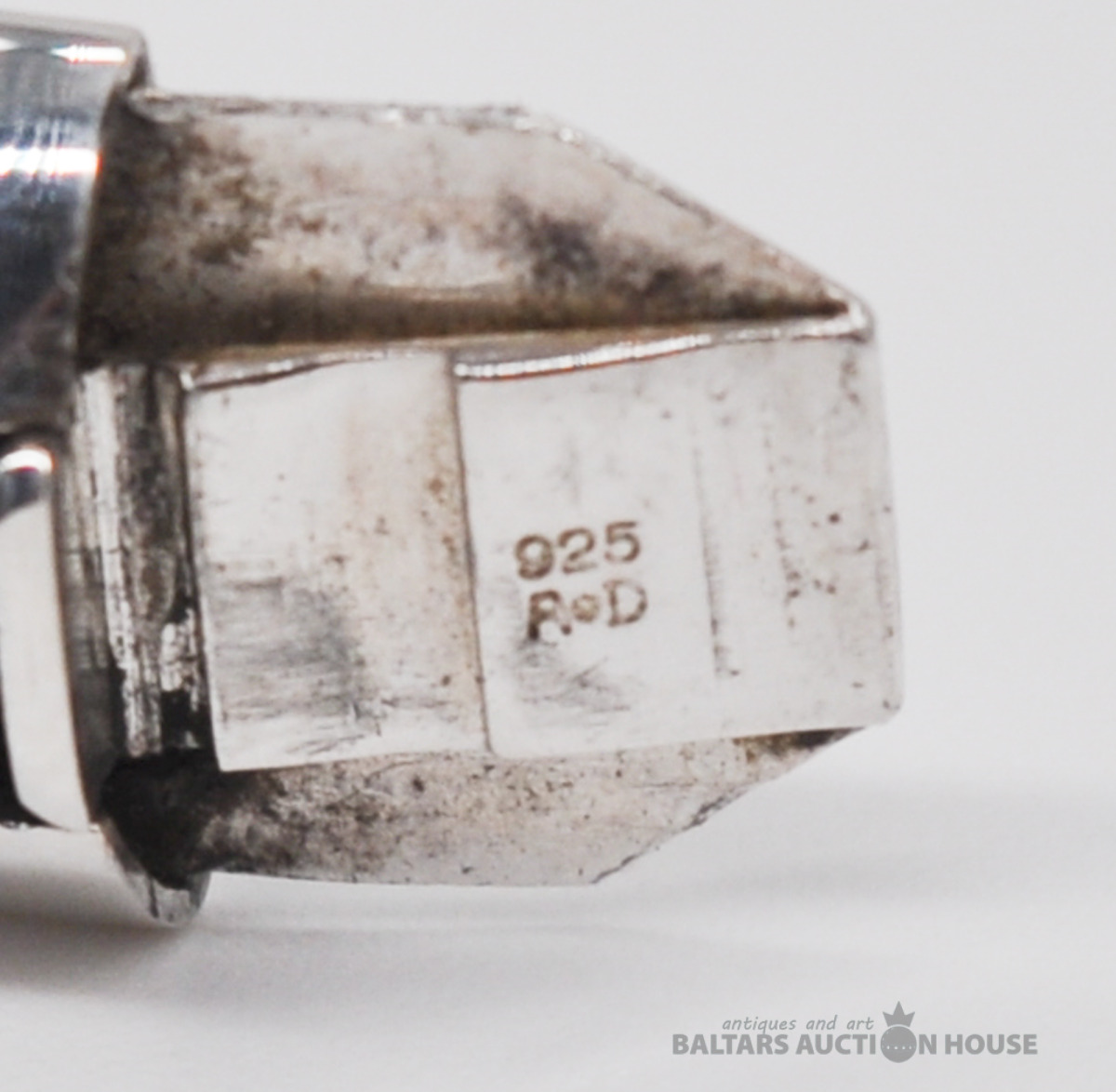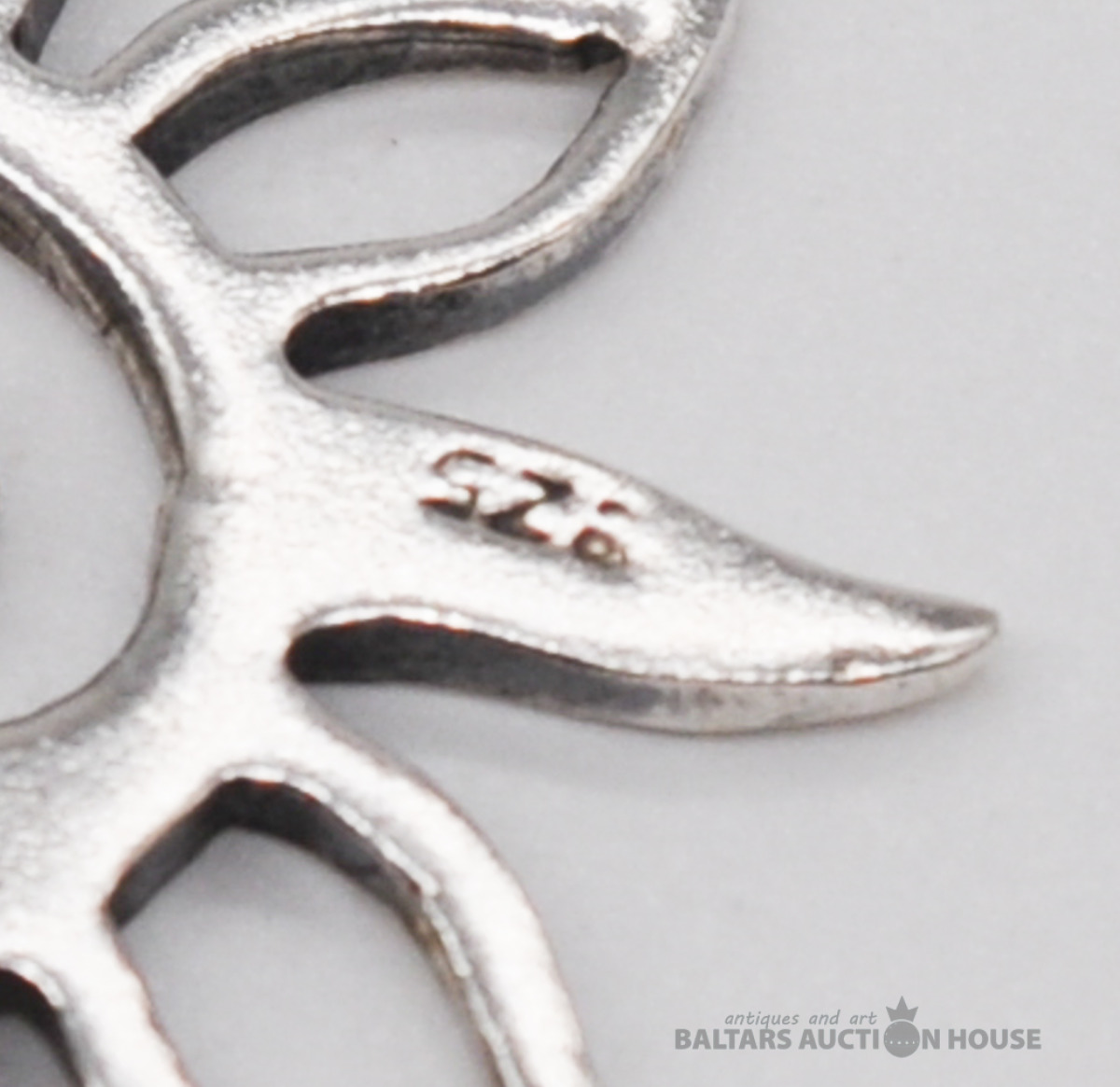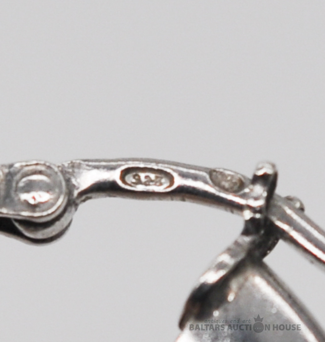 Art Deco stila piespraude ar baltiem akmeņiem. Sudrabs, 925. prove. Svars 5,55 grami. Augstums 7 cm.