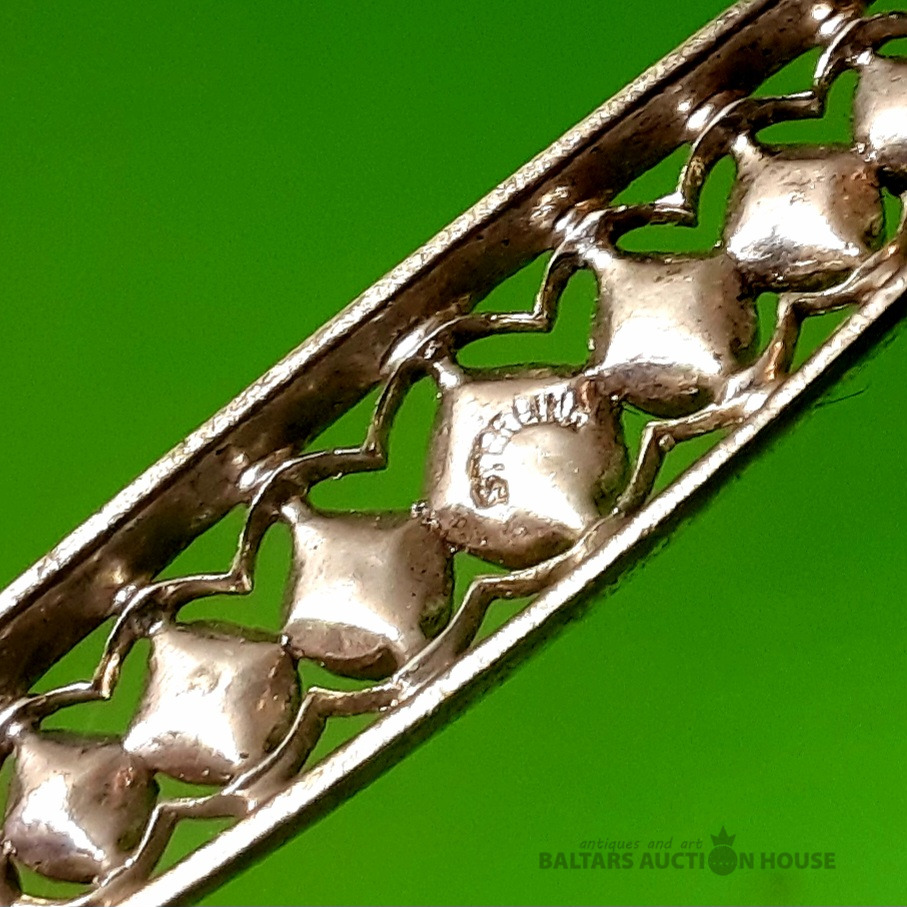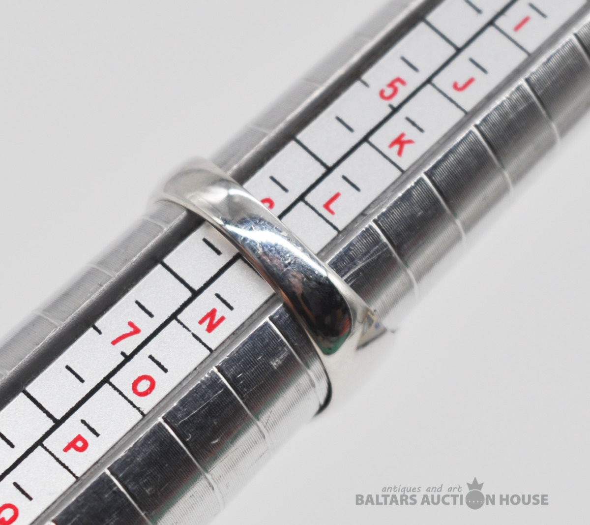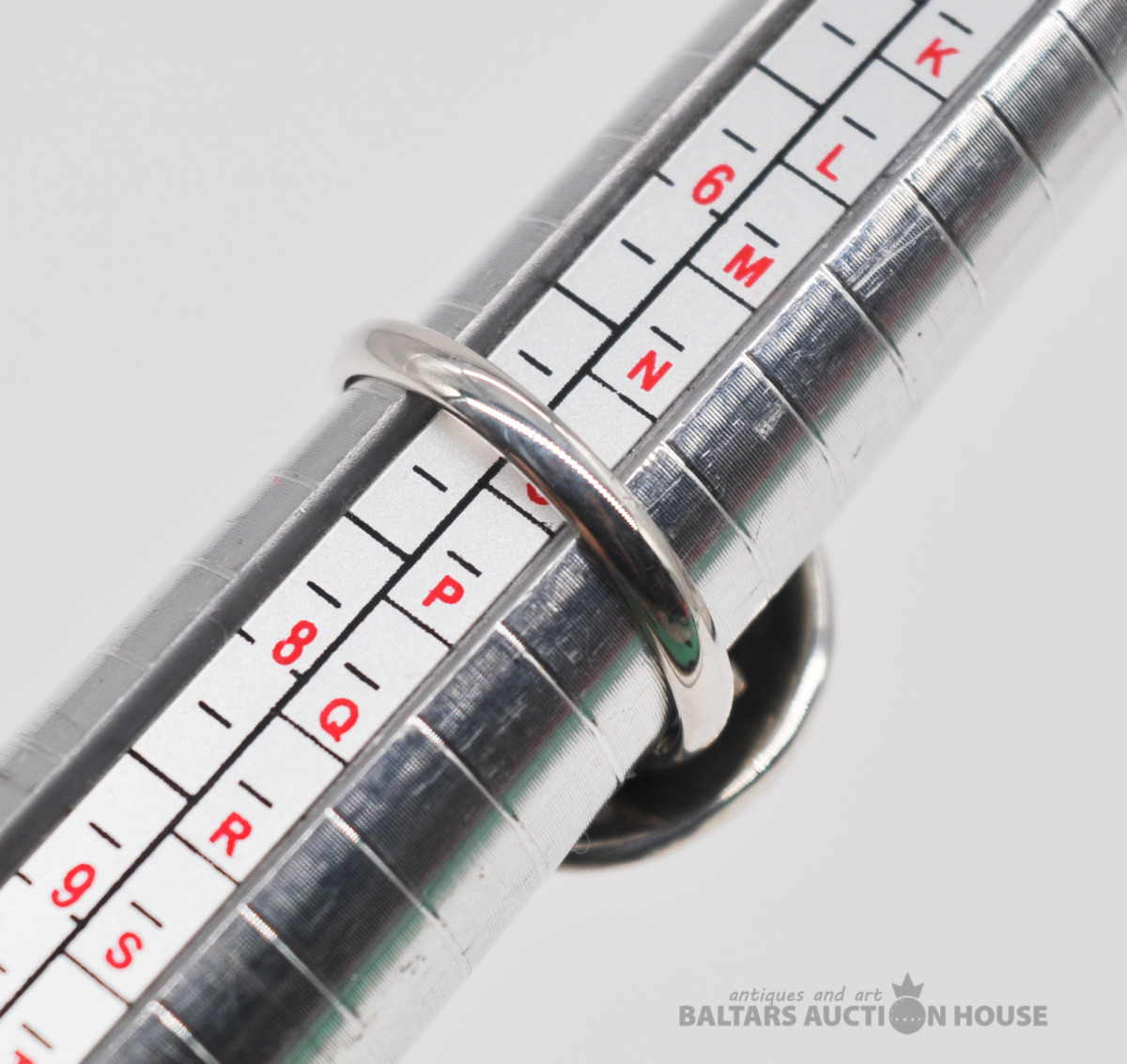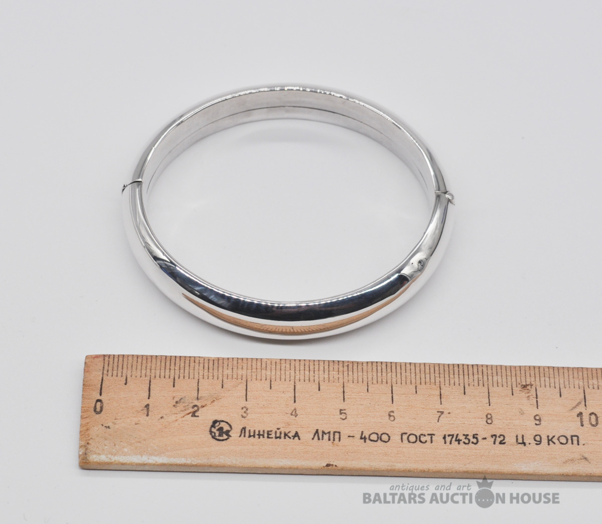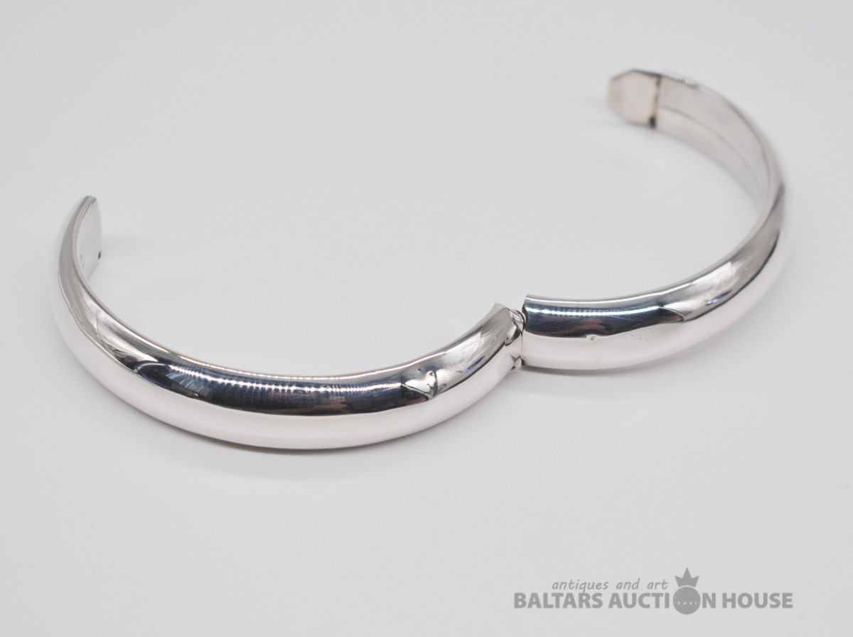 Sudraba aproce. Ārējais garums 21.5 cm. Iekšējais diametrs 62 mm. Platums 12.5 mm. Svars 29.8 grami.