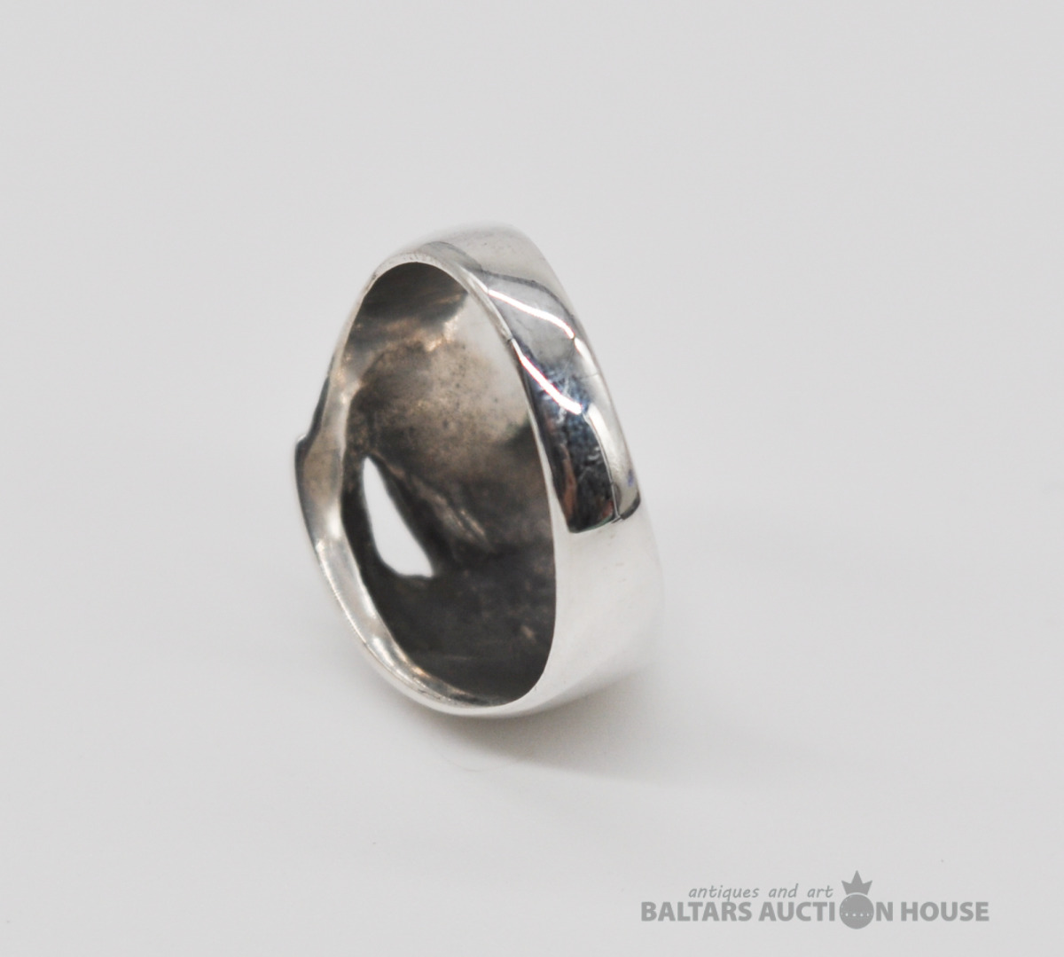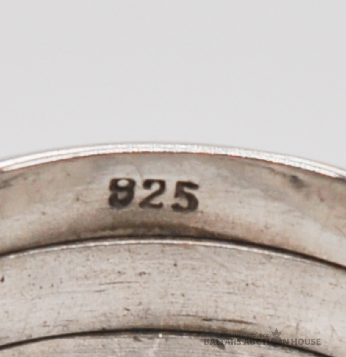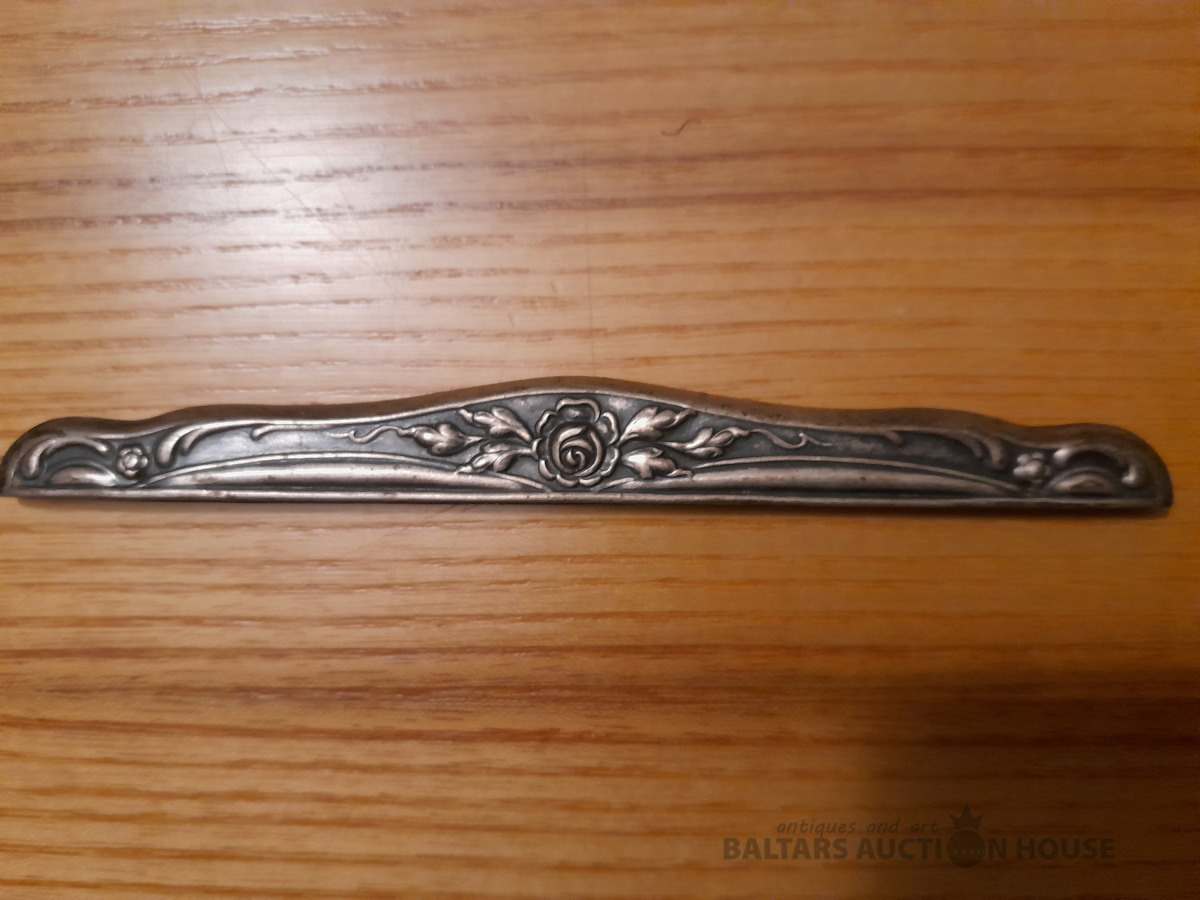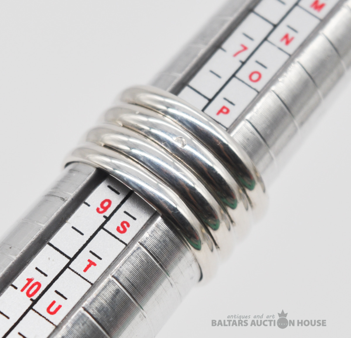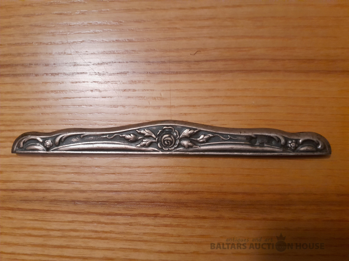 Sudraba aproce. Ārējais garums 21.5 cm. Iekšējais diametrs 62 mm. Platums 12.5 mm. Svars 29.8 grami.