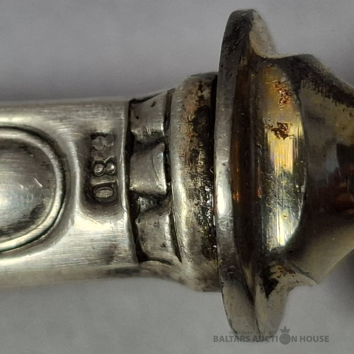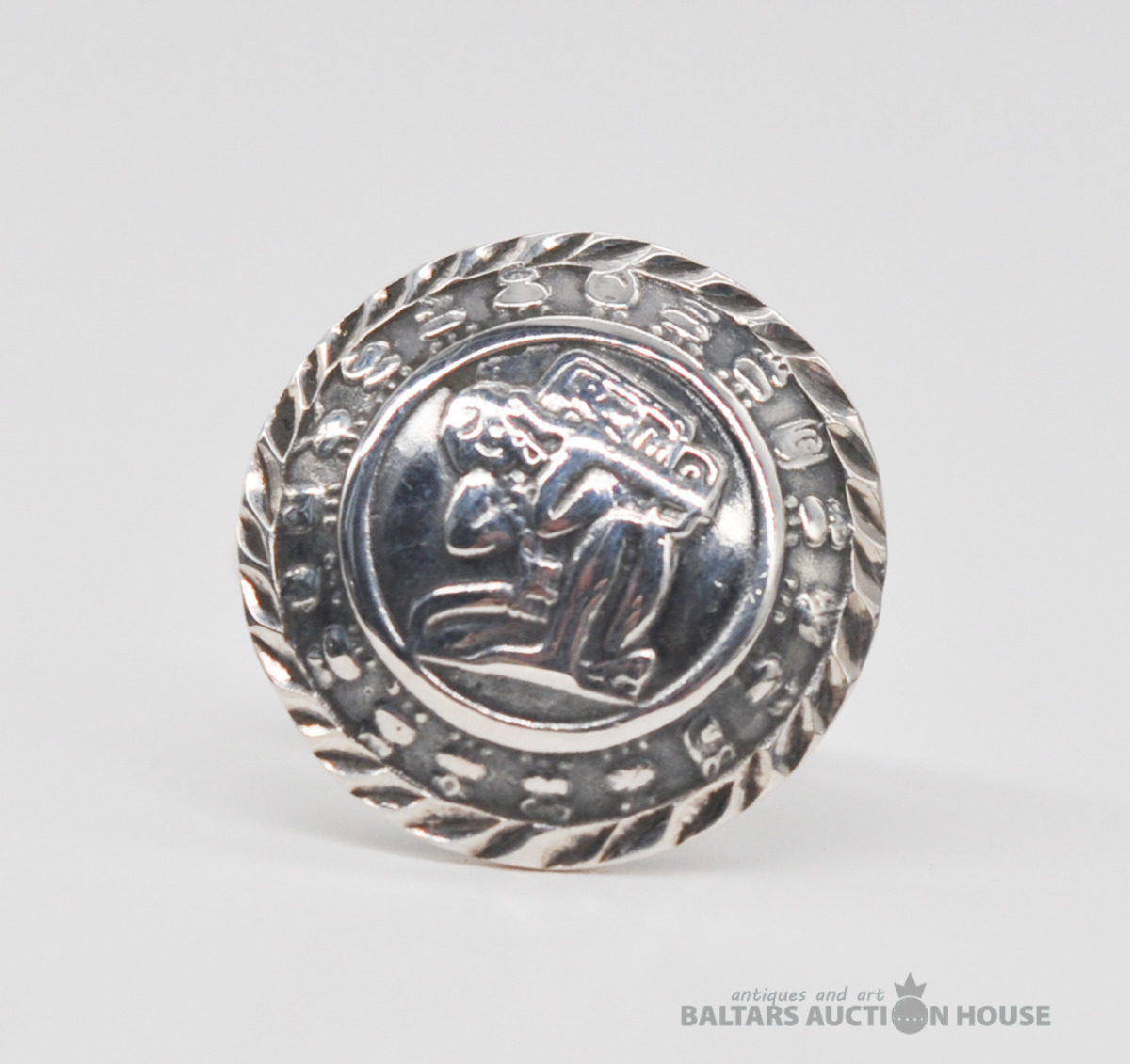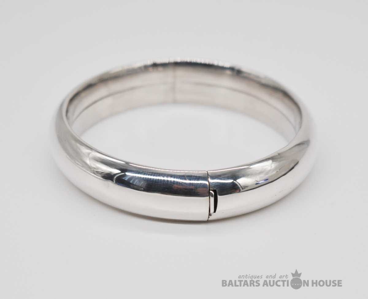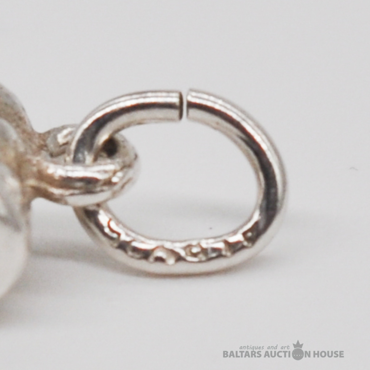 Sudraba aproce. Ārējais garums 21.5 cm. Iekšējais diametrs 62 mm. Platums 12.5 mm. Svars 29.8 grami.