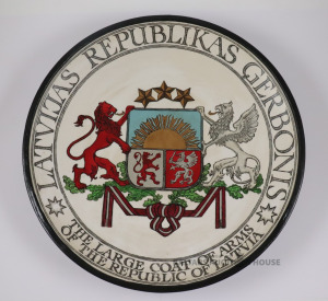 Sienas šķīvis LATVIJAS REPUBLIKAS ĢERBONIS. Autors Ēriks Priedkalns, roku gleznojums, āda, porcelāns. h=5,7 cm, d=36 cm