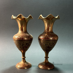 Divas kamīna vāzītes, varu saturošs metālu sakausējums, roku darbs, gravējums ar roku, emalja, augstums 16 cm.