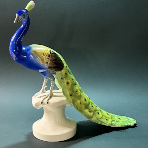 Statuete PĀVS, fajanss, roku darbs forma un gleznojums, Čehoslovākija, pēc zīmoga 1918.-1939.g., eksportam, augstums 33 cm, rūpnīcas nosaukums: Royal Dux Bohemia (agrāk Duxer Porzellan-Manufaktur AG), rūpnīcas zīmogs, novērtēts 200-250 USD, bet cekuls putnam remontēts, tāpēc vērtība zemāka.