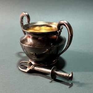 Cukura trauks un cukura trīszaru tvērējs, abi priekšmeti marķēti ar ražotāja zīmogiem, sudrabojums, gravējums ar štiheli, trauka iekšpuse zeltījums?, trīszaru tvērējs Triplex Zviedrija, patentēts, izgatavots periodā 1880.-1930. gads. Cukurtrauka lielums 14x9 cm, augstums 9 cm.
