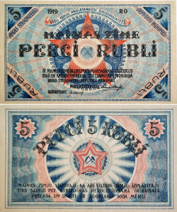 5 rubļi, 1919 g., Latvija, Rīģas strādnieku deputatu padomes maiņas zīme.Lielisks stāvoklis.