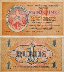 1 rublis, 1919 g., Latvija, Rīgas strādnieku deputatu padomes mainas zīme.