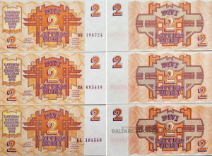 1992. gada Latvijas banknošu komplekts. (Repše). 2 rubļi. 3 gab.