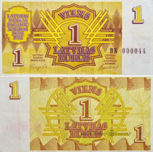 1992. gada Latvijas banknote (Repše). 1 rublis. Skaists skaitlis BK 000044.