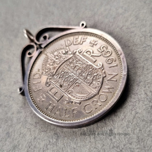 KULONS, izgatavots no 1965. gada Lielbritānijas puskronas monētas. Sudrabs. Apmales mala ir apzīmēta ar SUDRABS (monēta ir pārvietojama). Ļoti labā stāvoklī.