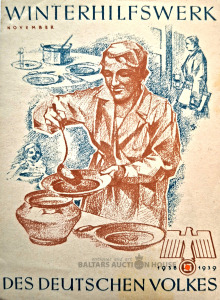 Plakāts vai pastkarte ikgadējai līdzekļu vākšanas kampaņai "Ziemas palīdzība vācu tautai", kas nacistiskajā Vācijā norisinājās no 1933. līdz 1945. gadam. 1938.–1939. gada kampaņas mērķis bija palīdzēt trūcīgajiem pilsoņiem, nodrošinot viņiem pirmās nepieciešamības preces, piemēram, pārtiku, apģērbu un ogles.Izmēri: 10,5 cm x 7,5 cm. Ideālā stāvoklī.