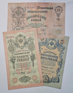 Banknote, Krievijas Imperija 5,10 25 rubļi, VF-VF+