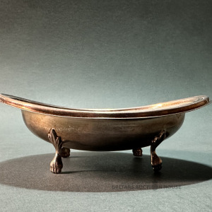 Sudraba SALDUMU TRAUKS ar lauvas ķepām, itāļu zīmols GREGGIO ar vēsturi no 1948.gada, sudrabs 925, svars 84 grami, lielums 14.5x11.5 cm, viens lāzera zīmogs un 3 mehāniskie zīmogi.