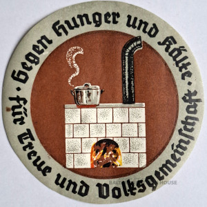 Durvju plāksne vācu labdarības organizācijas Winterhilfswerk (WНW) ikmēneša līdzekļu vākšanas kampaņai (Monatstürplakette). Uz tās attēlota plīts ar katlu un skursteni, ko ieskauj organizācijas saukļi. Diametrs: 10 cm.