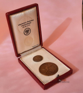 Vispārējā Vācijas Automobiļu kluba (ADAC) nozīmīte/medaļa. ADAC ir Vācijas autobūves asociācija, kas sniedz dažādus pakalpojumus, tostarp palīdzību uz ceļa. Uzraksti uz kastītes norāda, ka ražotājs ir Deschler & Sohn, Minhene.