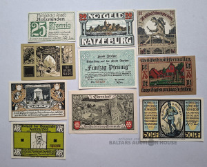 | Nosaukums | 10 notgeldu monētu partija. Ārkārtas nauda, kas emitēta Vācijā un citās valstīs ekonomiskās krīzes, kara vai standarta valūtas trūkuma laikā. Vācija |