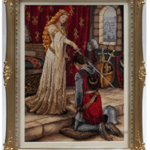 Gobelēns ATZINĪBA, pēc britu gleznotāja Edmunda Leightona (1852–1922) gleznas The Accolade (1901), antīks dabīga koka rāmis, paspartu, bezatspīduma profesionālais izstāžu stikls AR-70, lielums 45x35 cm.