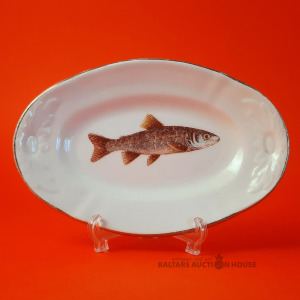 Fajansa šķīvis "Zivs" Latvija, Kuzņecova porcelāna fabrika. Izmērs: 13 cm x 8,5 cm.