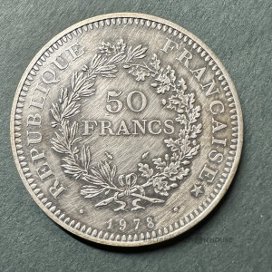 50 FRANCS Hercules, Francijas Republika, 1978.gads, sudrabs 900, svars 29.92 grami, diametrs 41 mm, nokalta Parīzē, gravieris Emile Rousseau, AU/UNC, metāla vērtība 68 EUR.