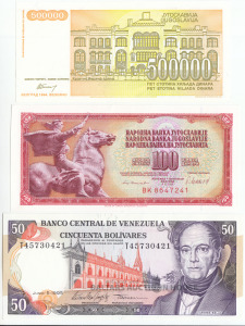 Banknotes, Jugoslavija/Yugoslavia 100 (1981) un 500000 dināri (1994), Venecuēla, 50 Bolivari 1995, UNC