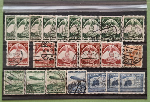 Trešā reiha (Deutsches Reich) vintage pastmarku kolekcija no 20. gs. trīsdesmitajiem gadiem. Tēma: Pastmarkās ir attēli, kas saistīti ar Reihsparteitagu (NSDAP mītiņiem), cepelīniem (LZ 129) un gaisa pastu.