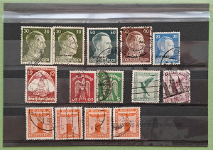 Trešā reiha (Deutsches Reich) pastmarku kolekcija. Uz pastmarkām ir attēli, kas saistīti ar nacistu ideoloģiju, tostarp Hitlera portreti un NSDAP simbolika. Uz dažām pastmarkām ir uzdrukāts uzraksts "OSTLAND"